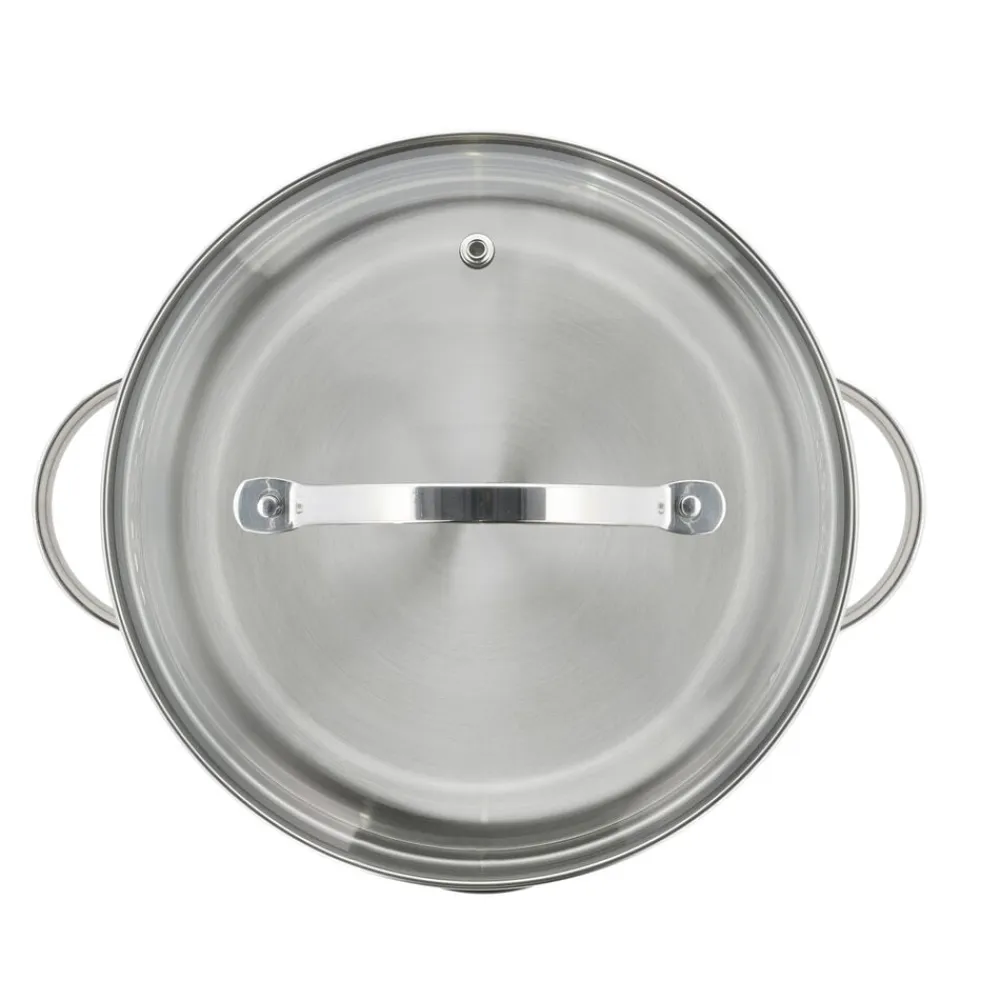 Glaslåg med si-funktion på to sider af låget sikrer, at vand kan hældes fra gryden uden at indhold kommer med.