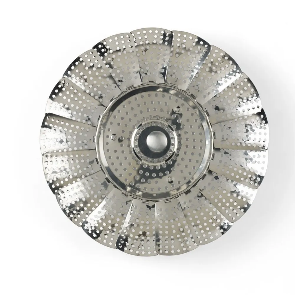 Dampede grøntsager smager af mere og bevarer vitaminerne bedre. Dampindsatsen sættes ned i en gryde med lidt vand og er også velegnet til dampning af fisk og skaldyr. Dia. 28 cm, rustfrit stål med foldbare ben og teleskophåndtag.