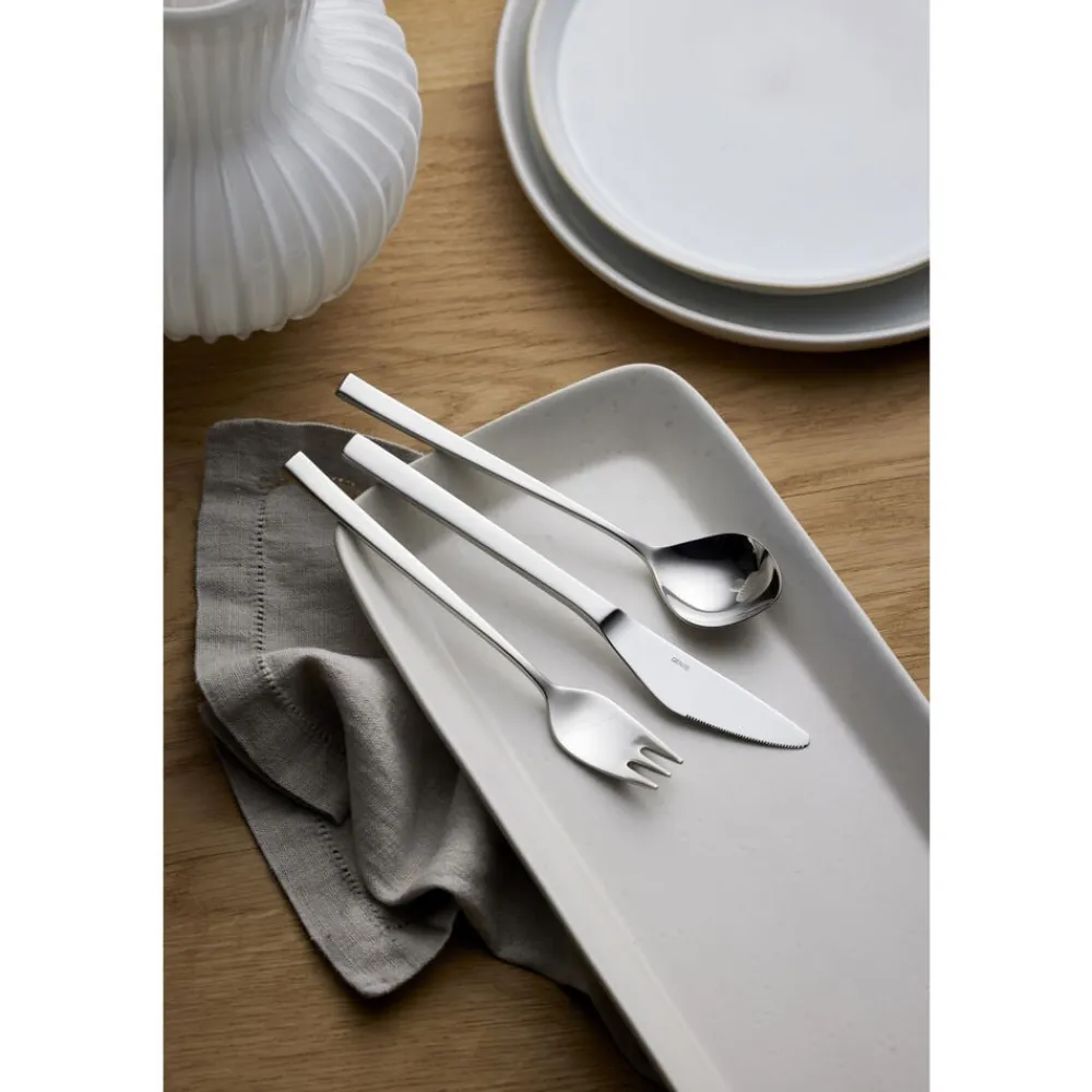 Gense Fuga har et klassisk design med blødt afrundede linjer, der hviler behageligt i hånden, og en raffineret kontrast i de matte skafter og blankpolerede hoveder. Tias Eckhoff formgav i 1962 det ikoniske bestik, der i sit design formidler klarhed og præcision, men med et subtilt udtryk.