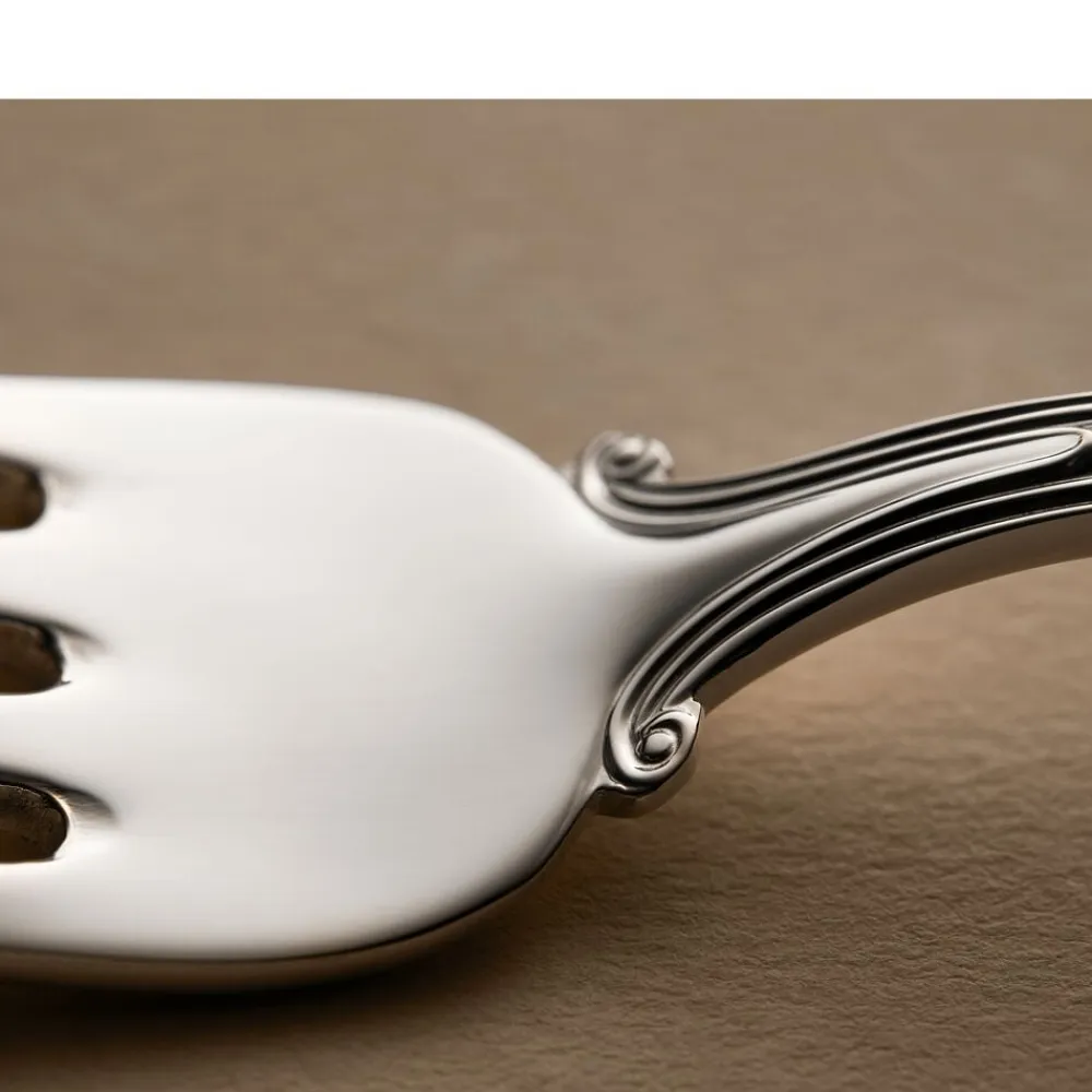 Olga har sin oprindelse i den engelske nyrokoko fra det 19. århundrede. Bestikket er designet til at passe til den tids storstilede borddækninger med krystalglas og smukt foldede servietter. Og det gør sig mindst lige så godt i dag – uanset stil og øvrige omgivelser. Med sine levende bladmønstre er det et design, der tager form og bliver noget, man snakker om rundt om bordet.