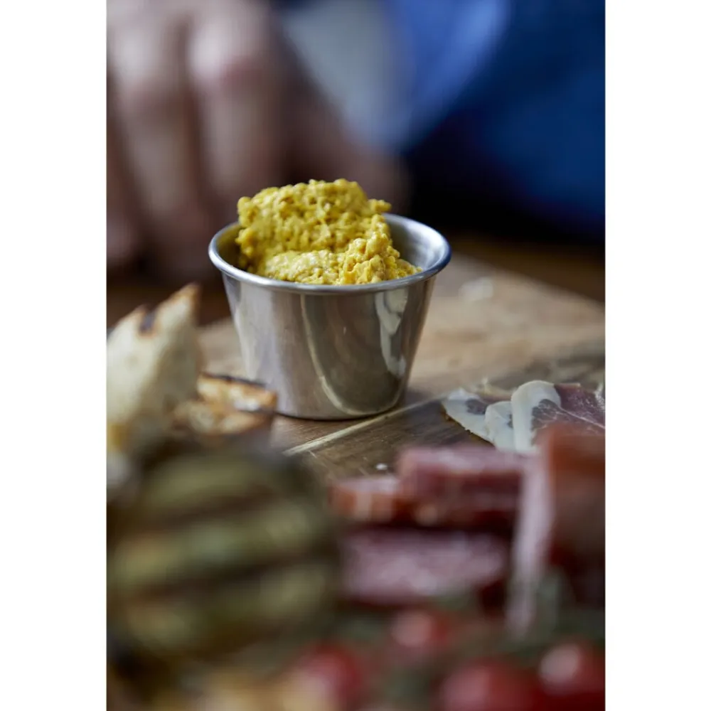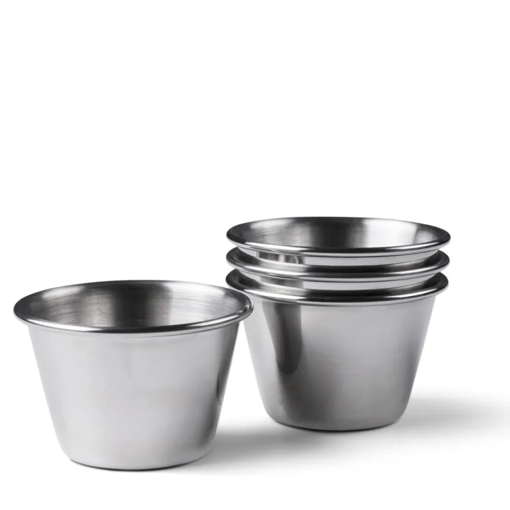 4 små skåle i rustfrit stål med blank yderside og mat inderside. Brug skålene til dip, saucer og lignende og sæt dem fx ved en flot anretning på tallerkenen. Skålene er 4 cm høje og 6 cm i diameter og rummer ca. 7 cl.