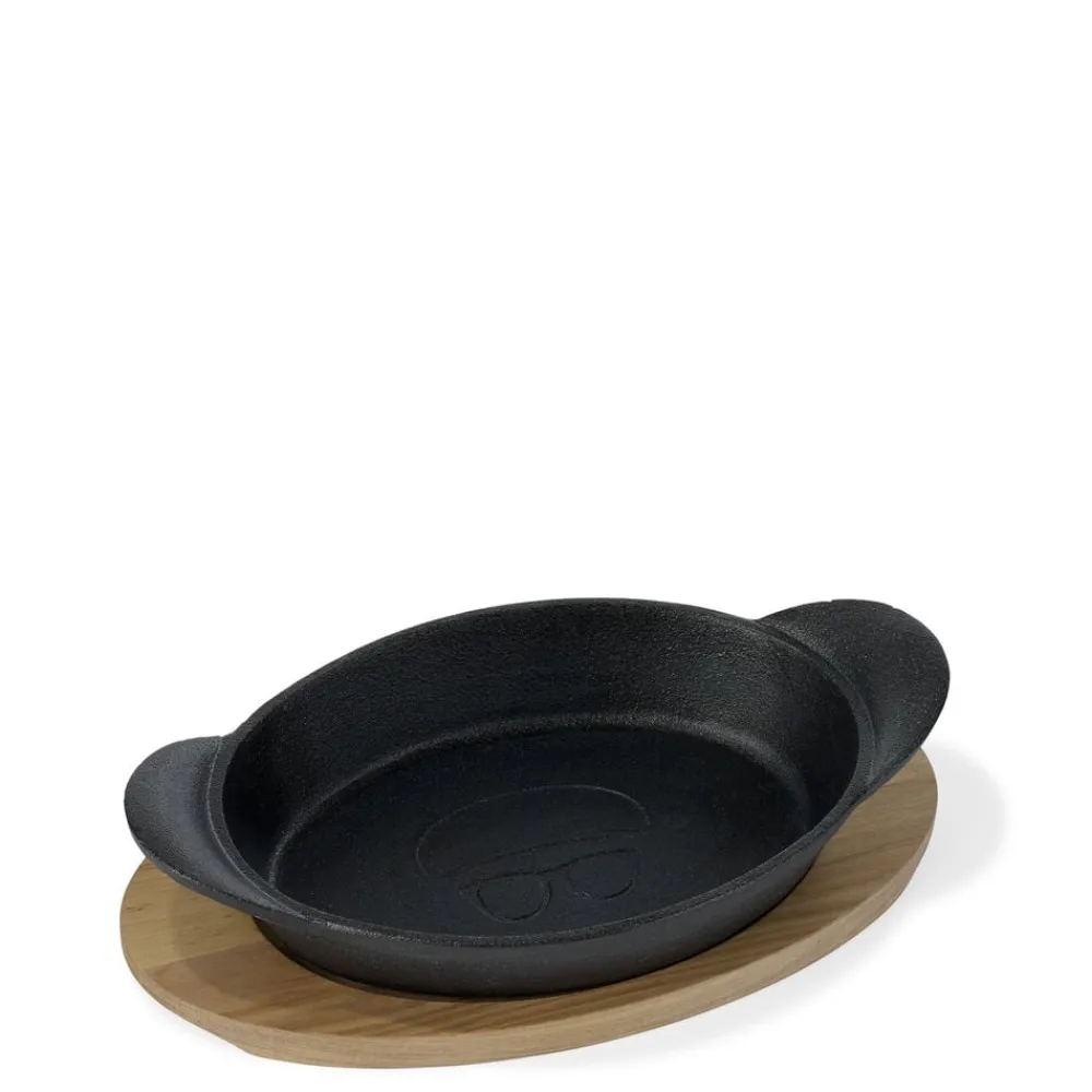 Fad/tallerken i støbejern og bordskåner i ahorn. Egner sig perfekt til servering, men også til tilberedning i grill eller ovn.