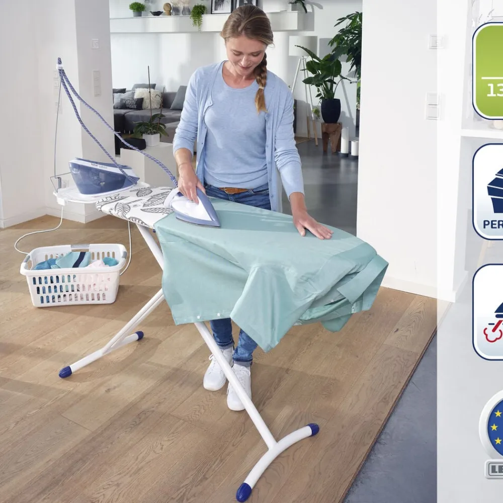 Airboard Express L Solid har alt, hvad et moderne strygebræt har brug for. Strygebrættet er ultralet og stabilt med ekstra stor strygeflade. Strygeoverfladen måler 130 x 38 cm og arbejdshøjden kan justeres mellem 76 og 100 cm. Airboard Express L Solid er både nemt at stille op og folde sammen. Strygebrættet har en fast bakke til dampstationer samt en kabelholder, så ledningen ikke er i vejen for strygningen. Skjorter m.m. kan hænges på bøjleholderen på bakken efter strygning. Velegnet til strygejern og alle standarddampstationer. 5 års garanti
