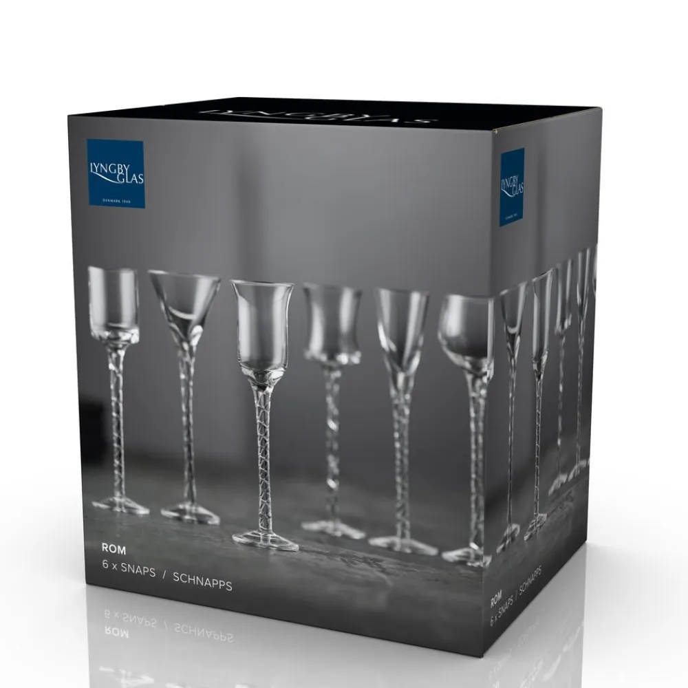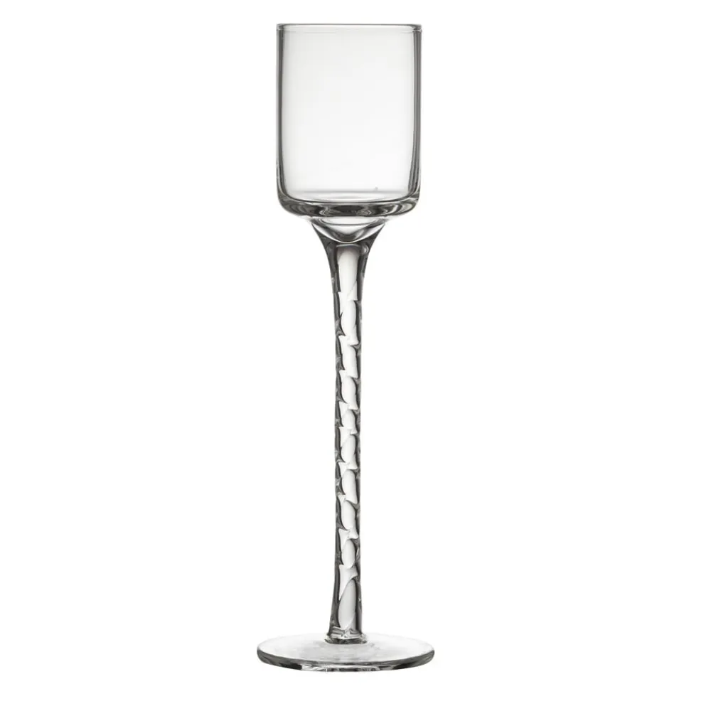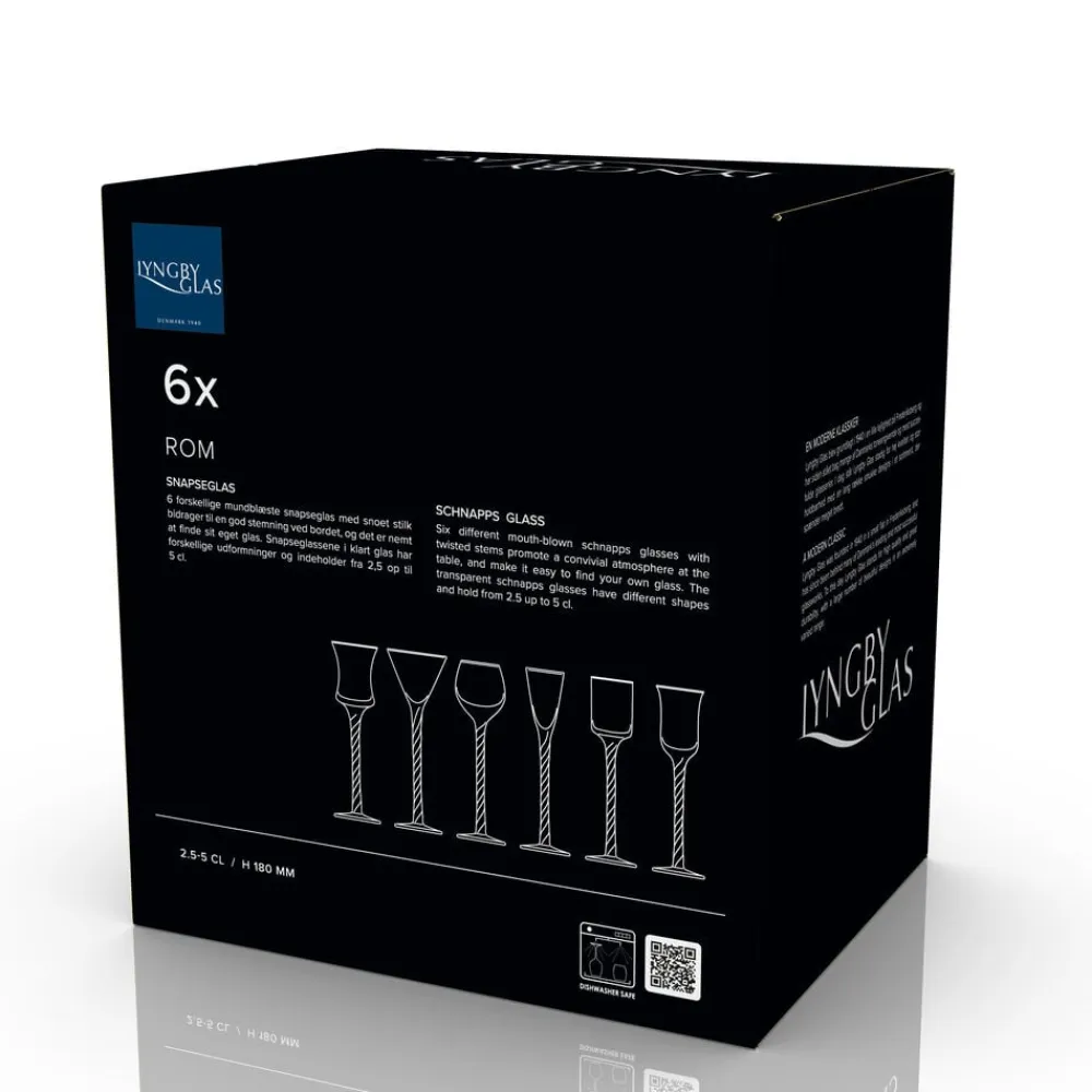 6 forskellige mundblæste snapseglas med snoet stilk bidrager til en god stemning ved bordet, og det er nemt at finde sit eget glas. Snapseglassene i klart glas har forskellige udformninger og indeholder fra 2,5 op til 5 cl. H 18 cm.