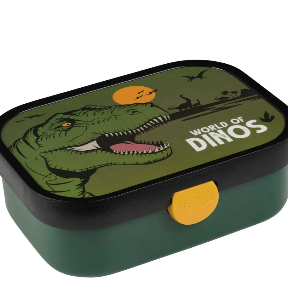 Madkasse med flotte illustrationer af klassiske dinosaurer. Den har en ny, forbedret lukkemekanisme, som er endnu nemmere for børnene at betjene. Madkassen måler 17,5 x 13 x 6 cm og indeholder en lille gaffel og en aftagelig indsats med to små rum.