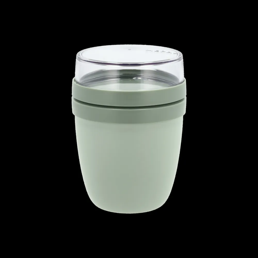 Mepal Ellipse frokostbæger Mini – til salat, yoghurt og lignende. 300 ml bæger med 120 ml topbeholder til müsli, dressing osv. – lige til at tage med. Ideel størrelse til snacks til børn. 100 % tæt og velegnet til mikroovn og opvaskemaskine.
