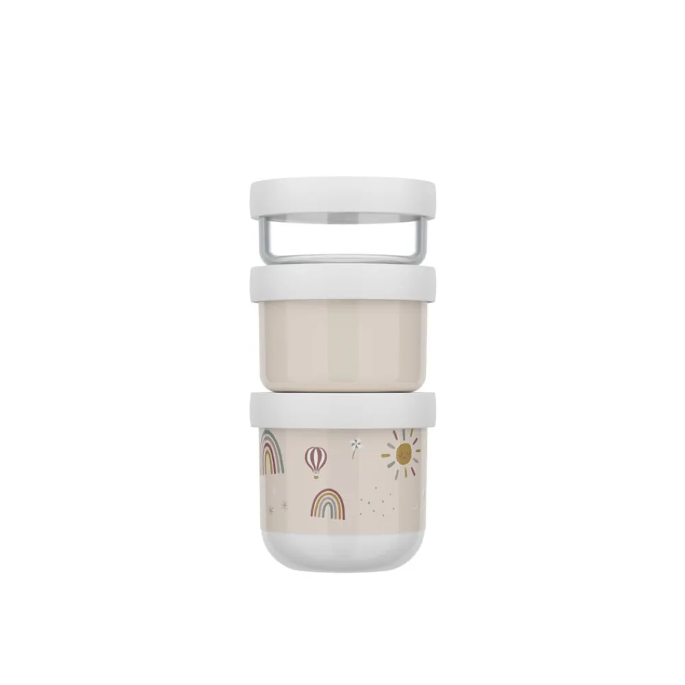 Mio snackboks-tårn består af tre snackbokse i forskellige størrelser, som nemt kan klikkes sammen og tages med på tur. Alle boksene har tætsluttende skruelåg. Den mindste boks er transparent og rummer 100 ml, den mellemste er ensfarvet og rummer 175 ml, mens den største har et karakteristisk Mio-motiv og rummer 275 ml. Alle tre størrelser tåler fryser, og de to største bokse kan også anvendes i mikroovn.