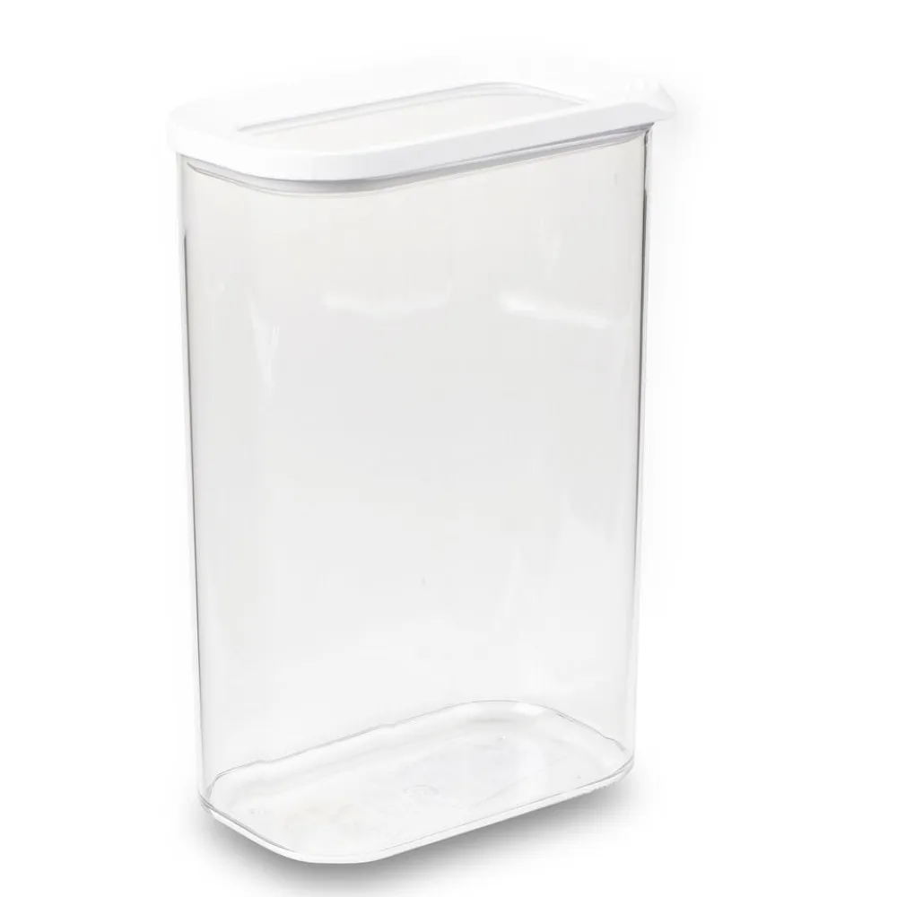 Modula opbevaringsboks med enkel, hvid kant på låget. Både boks og låg er gennemsigtige, hvilket gør det nemt at overskue indholdet. Mål: 14,5 x 9 x 22 cm Boksen er fremstillet af SAN-plast, som er robust og modstandsdygtig overfor ridser. Velegnet til opvaskemaskine men ikke til mikroovn og fryser.