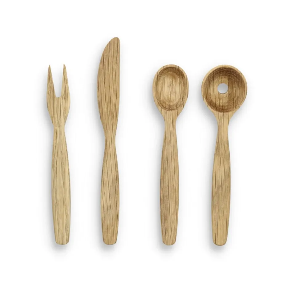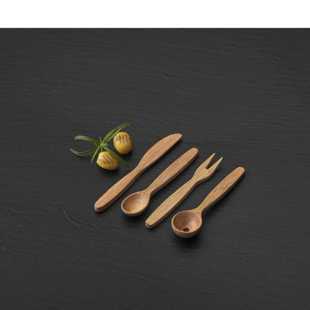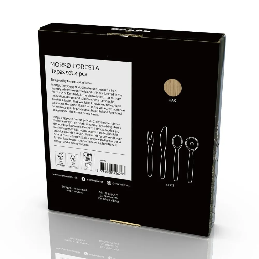 Med det stilfulde tapassæt er der lagt op til lækre hyggestunder med venner og familie. Sættet består af en olivenske, en almindelig ske og en smart gaffel, alle 14 cm, og en kniv på 16 cm.