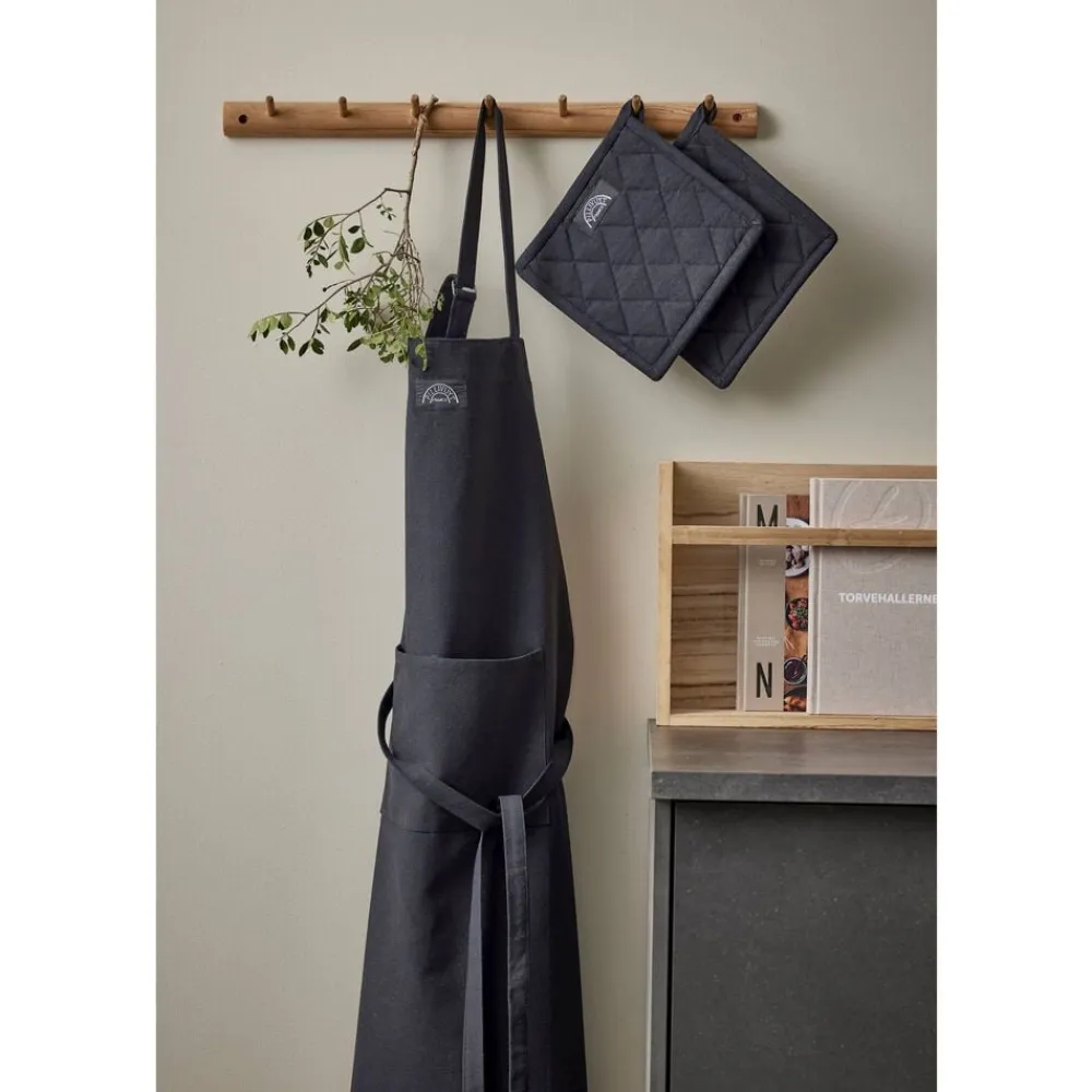 Køkkentekstiler i gode designs i både klassiske og moderigtige farver. Tekstilerne vaskes ved 40 grader. Overskudsfarve kan forekomme, især ved mørke farver, derfor anbefales separat vask. Brug vaskemiddel uden optisk hvidt og blegemiddel. Krympning 5-10 %. Tekstilet kan “trækkes” glat eller stryges.