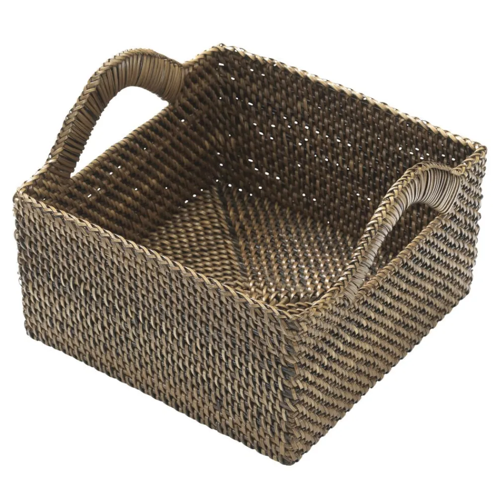 Denne kvadratiske kurv med håndtag er både stilfuld og praktisk. Kurven måler 18 x 18 x 9,5 cm, og den kompakte størrelse gør den velegnet til opbevaring af små genstande. (CP17)