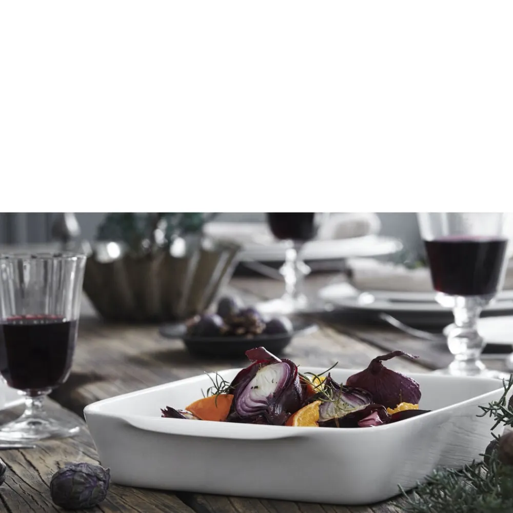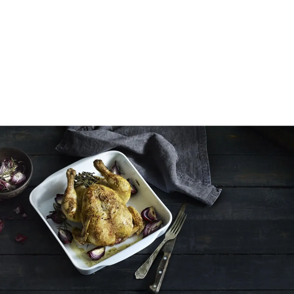 Kvadratisk fad på 27 x 27 cm med håndtag til ovnretter og til servering.