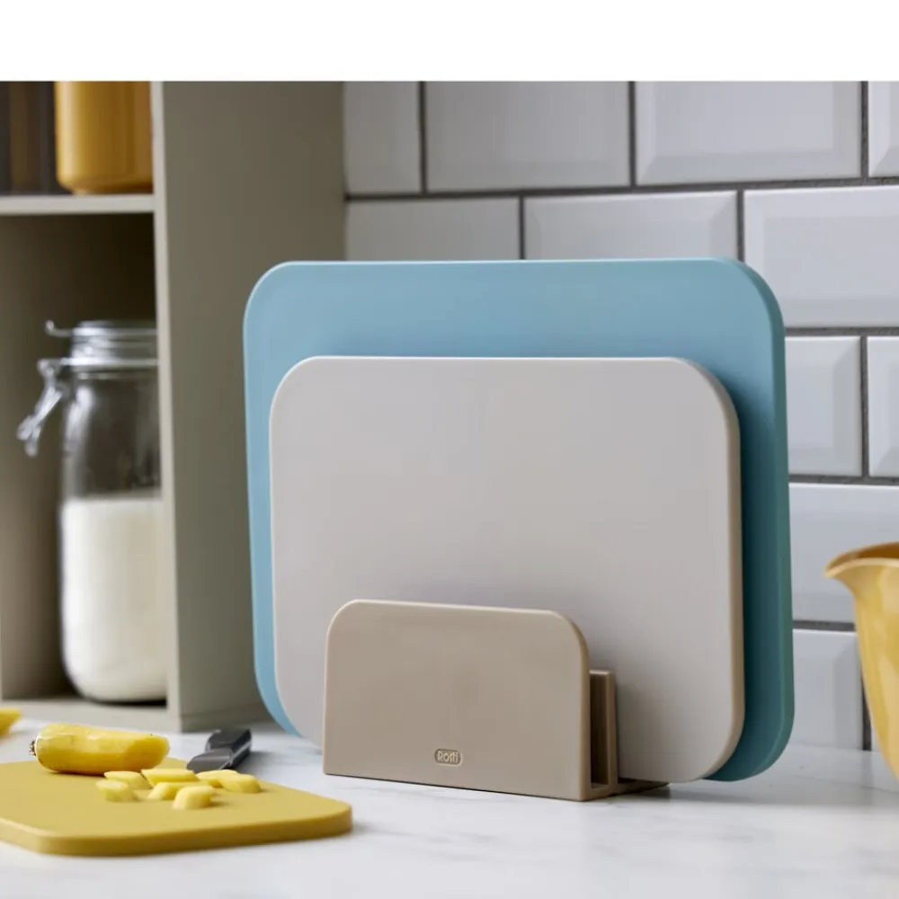 Sættet kommer med en smart holder med fokus på både opbevaring og hygiejne. Den holder skærebrætterne samlet, uden at de optager meget plads på køkkenbordet, og er udformet, så du kan sætte et fugtigt skærebræt direkte i holderen. Skærebrætterne står nemlig med lidt afstand til hinanden, og i bunden af holderen er der riller, som sikrer god ventilation og dermed hygiejne, f.eks. hvis brættet stadig er fugtigt, når det sættes på plads. Brætterne kan vaskes i opvaskemaskine.