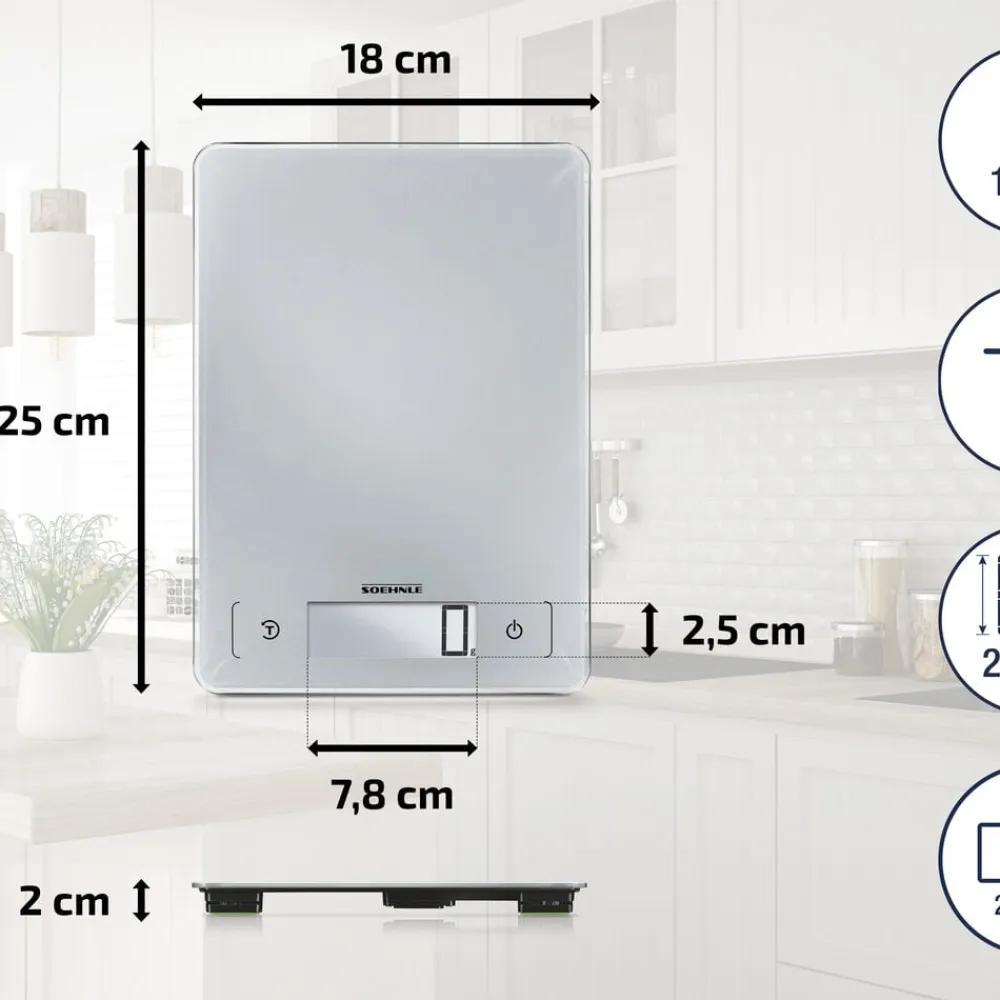 25 x 18 x 1,8 cm. Automatisk off-funktion, tara-funktion. 2 x 1,5V AA batterier er inkluderet. Tüv-certificeret. 3 års garanti.