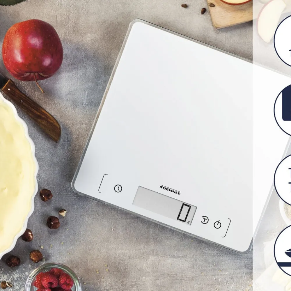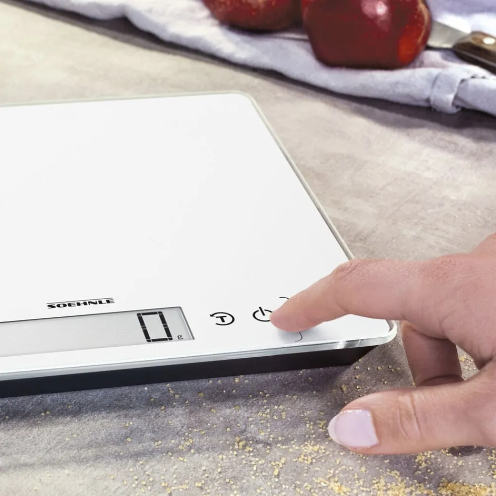Køkkenvægt i kompakt og ekstra tyndt design, 22 x 22 x 1,8 cm. Vejer op til 10 kg med interval på 1 g, hvilket gør den ideel til fx krydderier. Letlæseligt display, tarafunktion og energisparende autosluk-funktion. Enhederne vises i g/kg eller oz/lb.