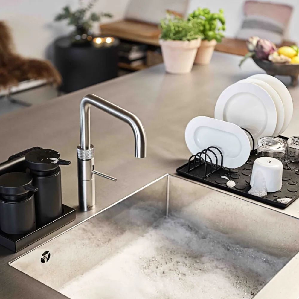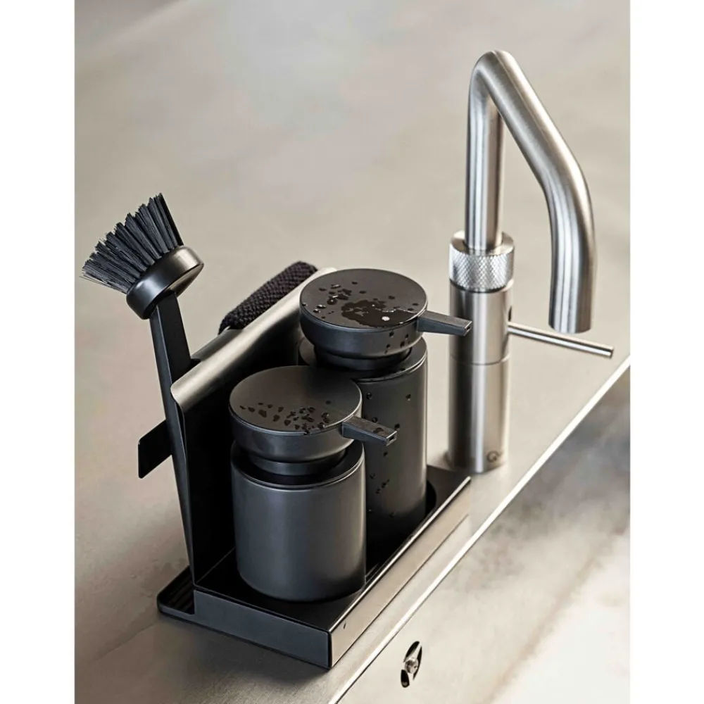 I front står dispenser-duoen til opvaskemiddel og håndsæbe/sprit. Begge dele er udført i keramik. Backstage hænger den strikkede karklud til tørre ganske uset, til den skal i brug. Den får selskab af børsten i matchende farve. En sidste fiks detalje er den lille bundbakke, der opsamler overskydende vand, så det ikke ender på køkkenbordet.