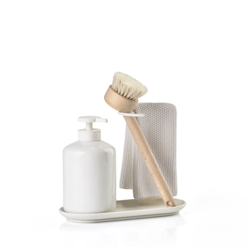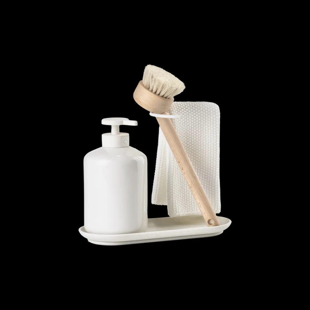 Her er lige dét, du skal bruge til hverdagens opvask, hverken mere eller mindre. En god og behagelig børste, en rummelig dispenser til sæbe, en matchende karklud samt en silikonebakke, der sætter scenen på smukkeste vis. Stålstellet, der holder sættet samlet, er rundet i toppen, så det set ovenfra former en fin halvcirkel. Den er let at gribe om, så du kan flytte sættet, når du fx skal gøre rent. Samtidig tilbyder stellet børsten et sted at hvile og kluden en plads at tørre på. Gennemtænkt, fint og feminint design fra NEU Studio.