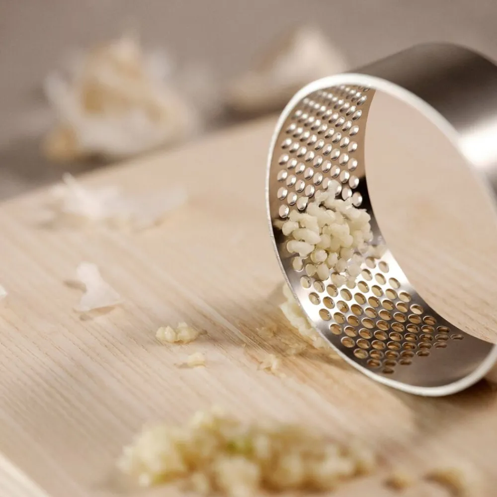 Forførende enkel – så kort kan man beskrive hvidløgspresseren fra Zone Denmark. Form og funktion følger hinanden i et smukt og effektivt redskab helt uden mekaniske dele. Det eneste, du skal gøre, er at rulle den hen over hvidløgsfeddet og skrabe det pressede hvidløg af ringens inderside. Efterfølgende renses hullerne nemt og hurtigt med en børste under rindende vand. Fremstillet i rustfrit stål.