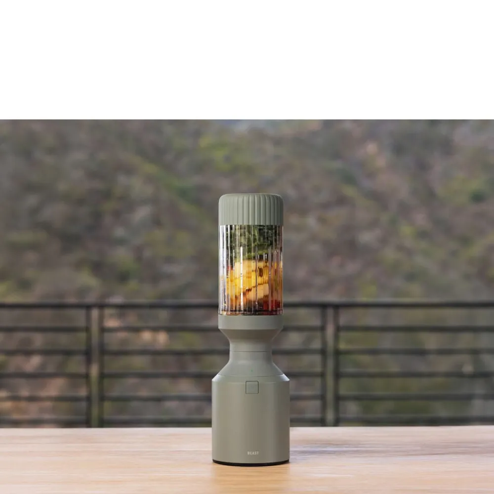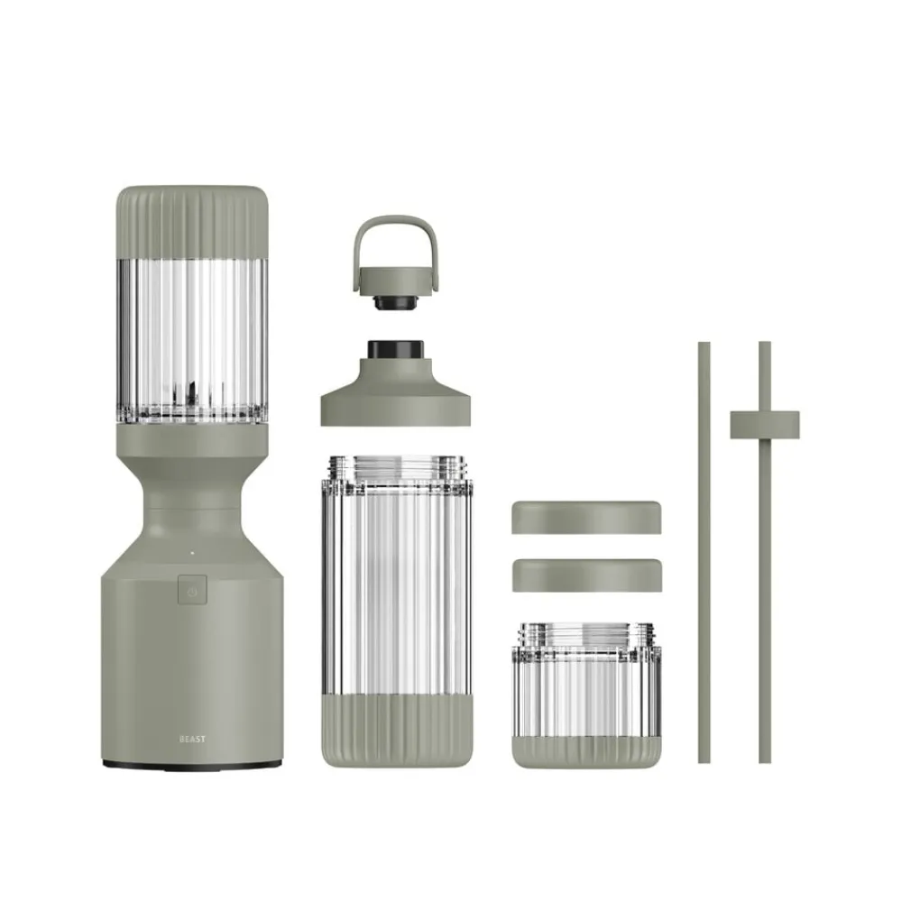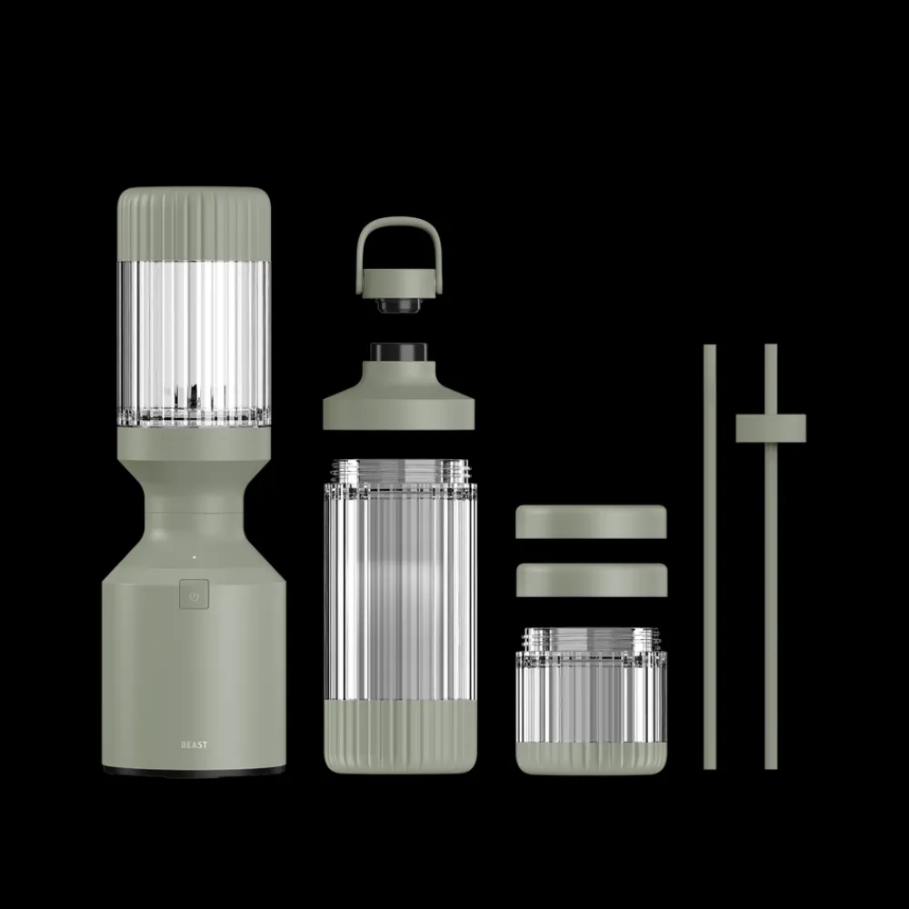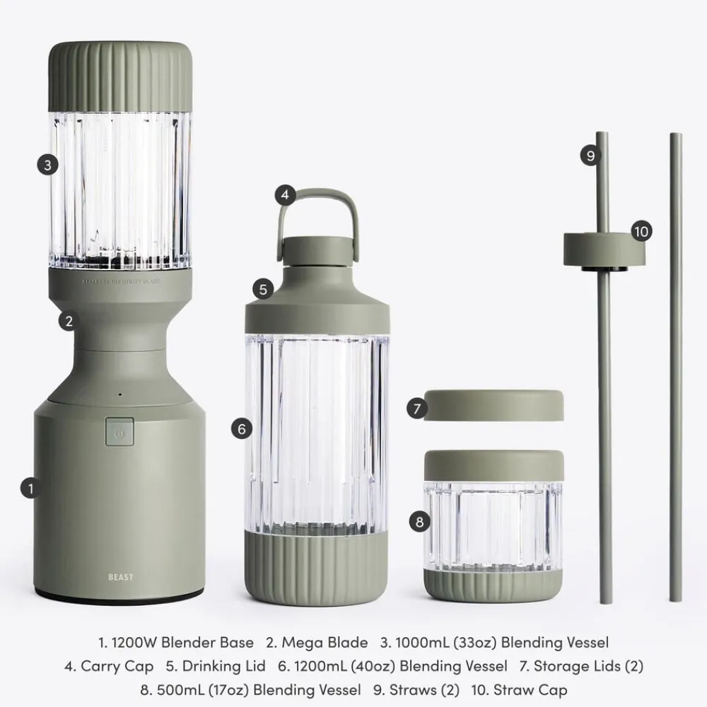 Beast Mega Plus 1200 leveres med tre blenderbeholdere (500, 1000 og 1200 ml), der fungerer som drikkebeholdere, når du sætter drikkelåg og sugerørshætte på og tager dem med dig på farten. Den rillede beholder giver dig et godt greb.