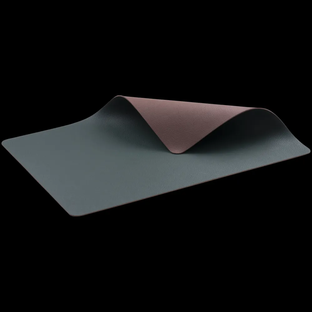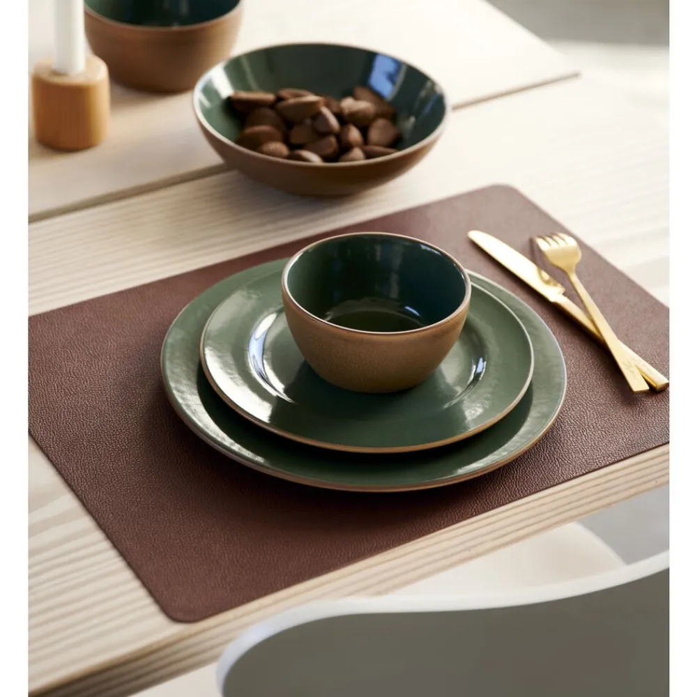 Vendbare dækkeservietter i praktisk vaskbart læderlook giver borddækningen et råt og moderne udtryk. Pinegrøn/mørkebrun.