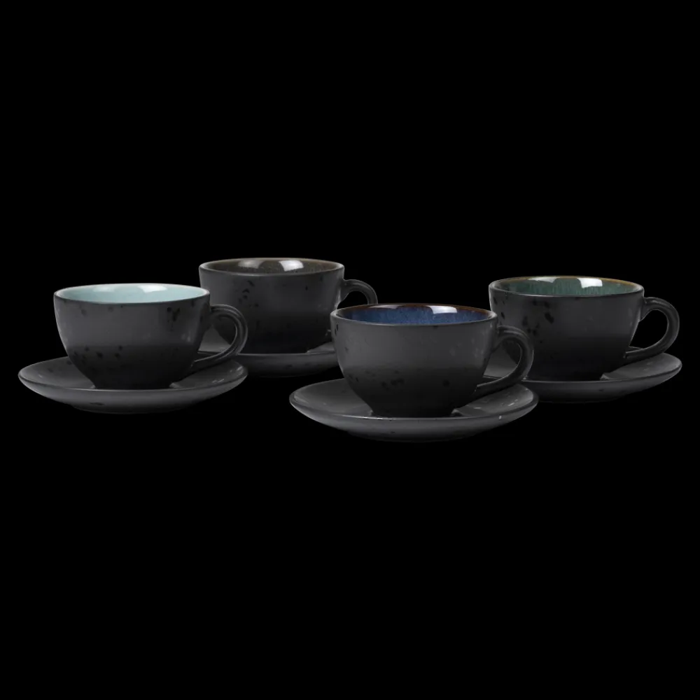 4 stk. Nyd din cappuccino og dine andre kaffefavoritter i den flotte BITZ Kop med underkop. Fremstillet i mat, sort stentøj med blank glasur i grøn, mørkeblå, lyseblå, grå på koppens inderside. 24 cl, 6 cm høj. Velegnet til maskinopvask, mikroovn og ovn op til 220 gr.