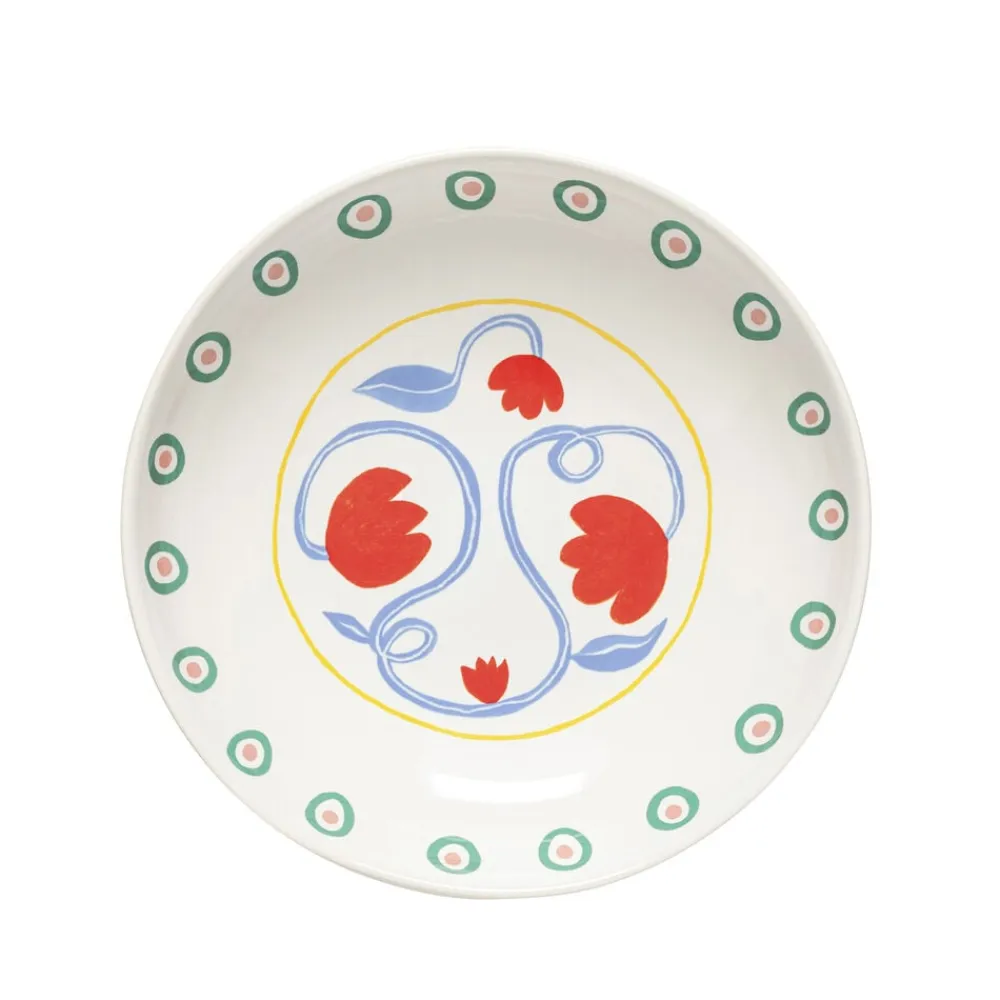 Salat-/pastatallerken, 23 cm. Den dybe tallerken bringer en følelse af sydlandsk lethed til bordet med sine røde blomster, der slynger sig yndefuldt om de lyseblå stængler. Perfekt til alt fra en cremet pastaret til en frisk salat. Brug den til måltider, der nydes langsomt og i godt selskab – præcis som ved et afslappet frokostbord i Sydeuropa.