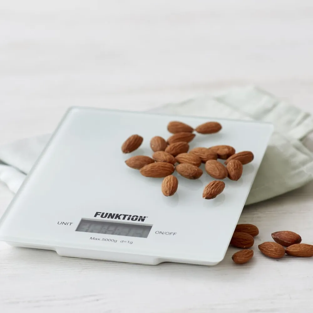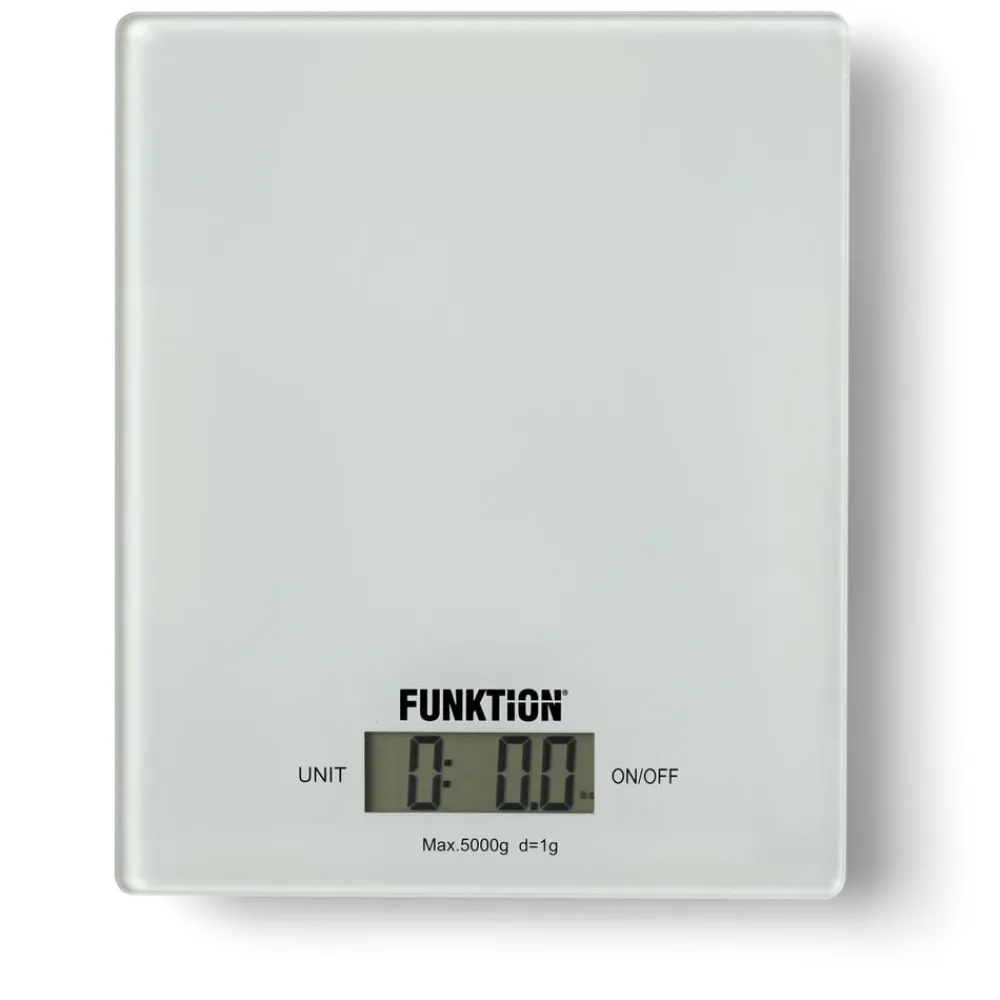 Køkkenvægt i hvid med 5 kg kapacitet og glasoverflade.