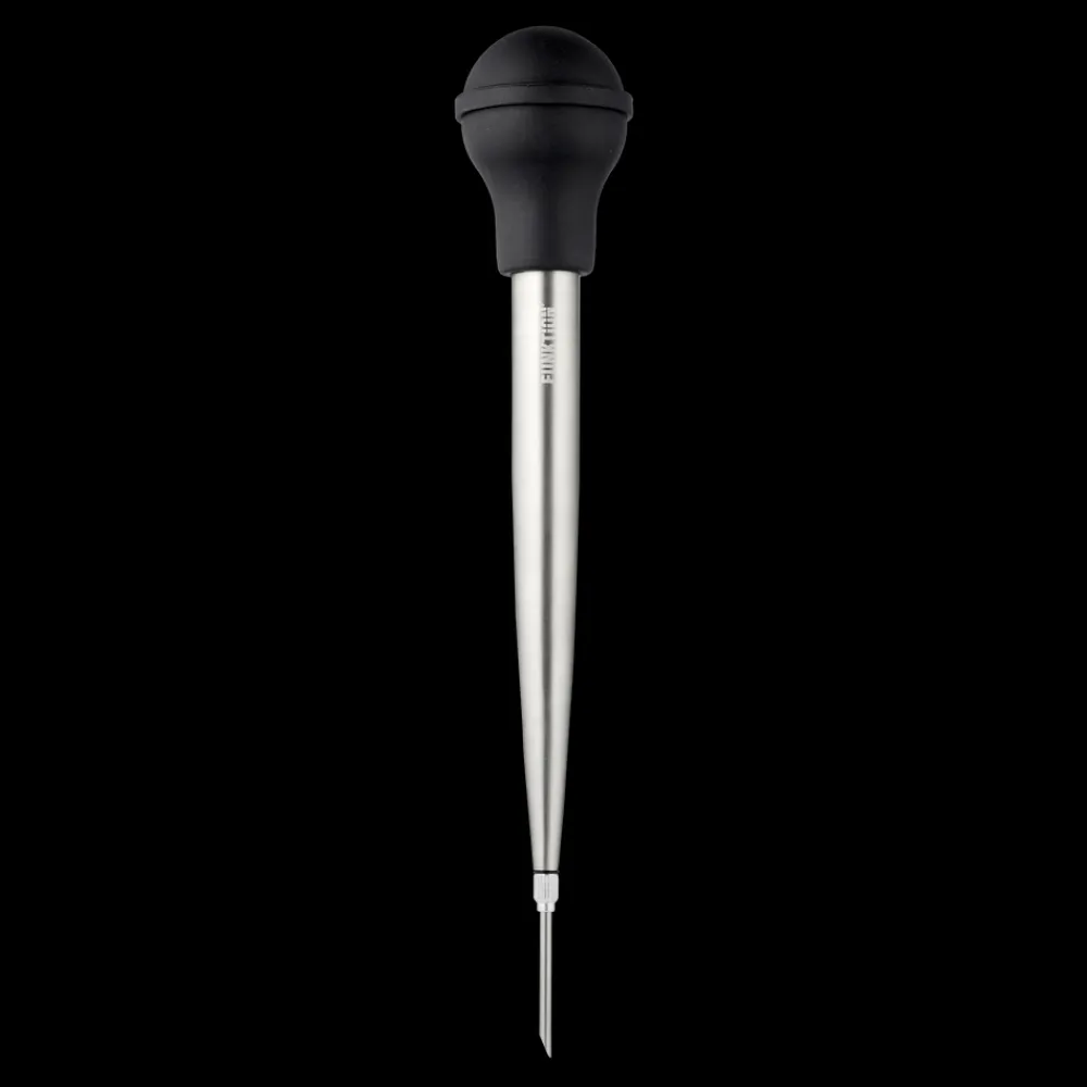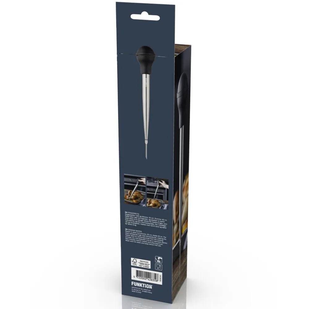 Stegepipette i stål og silikone, 32 cm. Rummer 40 ml. Stålet tåler høje varmegrader, og pipetten er derfor ideel både til at opsuge væske fra madlavningen, som fedtudskiller og som marinadesprøjte. Der medfølger nål og rensebørste. Velegnet til opvaskemaskine.