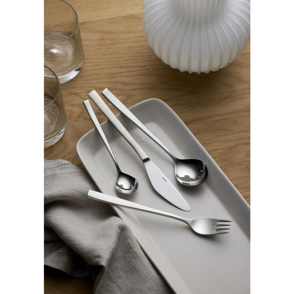 Gense Fuga har et klassisk design med blødt afrundede linjer, der hviler behageligt i hånden, og en raffineret kontrast i de matte skafter og blankpolerede hoveder. Tias Eckhoff formgav i 1962 det ikoniske bestik, der i sit design formidler klarhed og præcision, men med et subtilt udtryk.