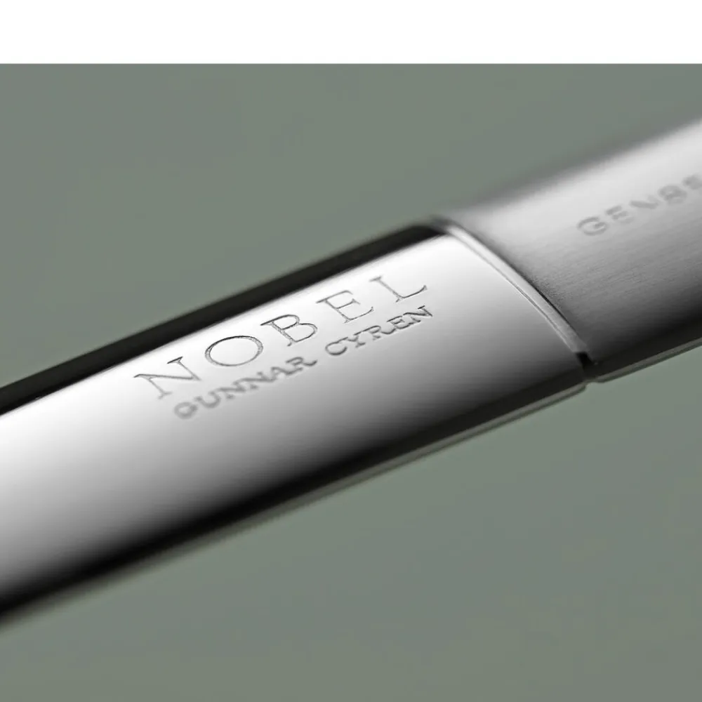 Nobel blev skabt af Gunnar Cyrén til Nobelprisudelingens 90-års jubilæum og er allerede blevet en klassiker. Bestikket er inspireret af begyndelsen af 1800-tallet og Karl XIV Johans sølvbestik. Et bestik, der er umiskendeligt svensk, men med nye detaljer, der overrasker. Nobel tilføjer det ekstra – uanset om du vælger at dække op helt traditionelt med hvide duge og kandelabre, eller moderne og trendy med nye materialer og borddekorationer. Nobel er fremstillet af rustfrit stål med let børstet skaft og højglanspoleret hoved, og det bruges stadig ved den årlige uddeling af Nobelprisen i Stockholm. Tåler opvaskemaskine.