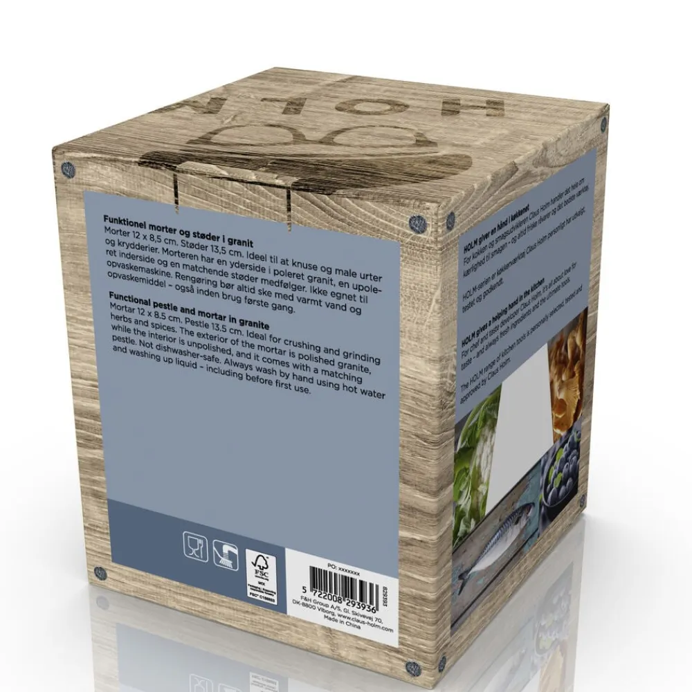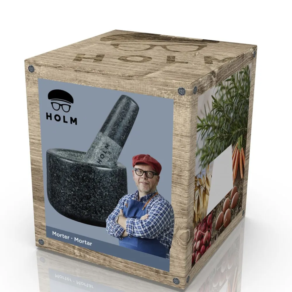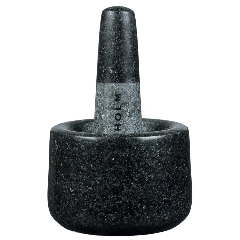 Morteren har en yderside i poleret granit, en upoleret inderside og en matchende støder medfølger.