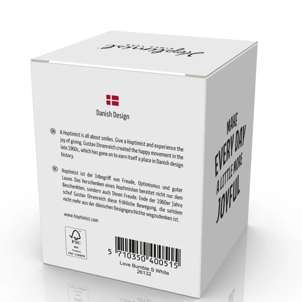 Love Bumble er til en du holder af. Måske en kæreste, din mor eller en person, du bare savner. Hoptimisten har et aftageligt hjerte, hvorpå du kan sætte en personlig hilsen til den, du kan lide. Der medfølger 6 klistermærker med teksten I Miss U, Best Dad, Best Mom, I Love U, Be Mine og Get well.