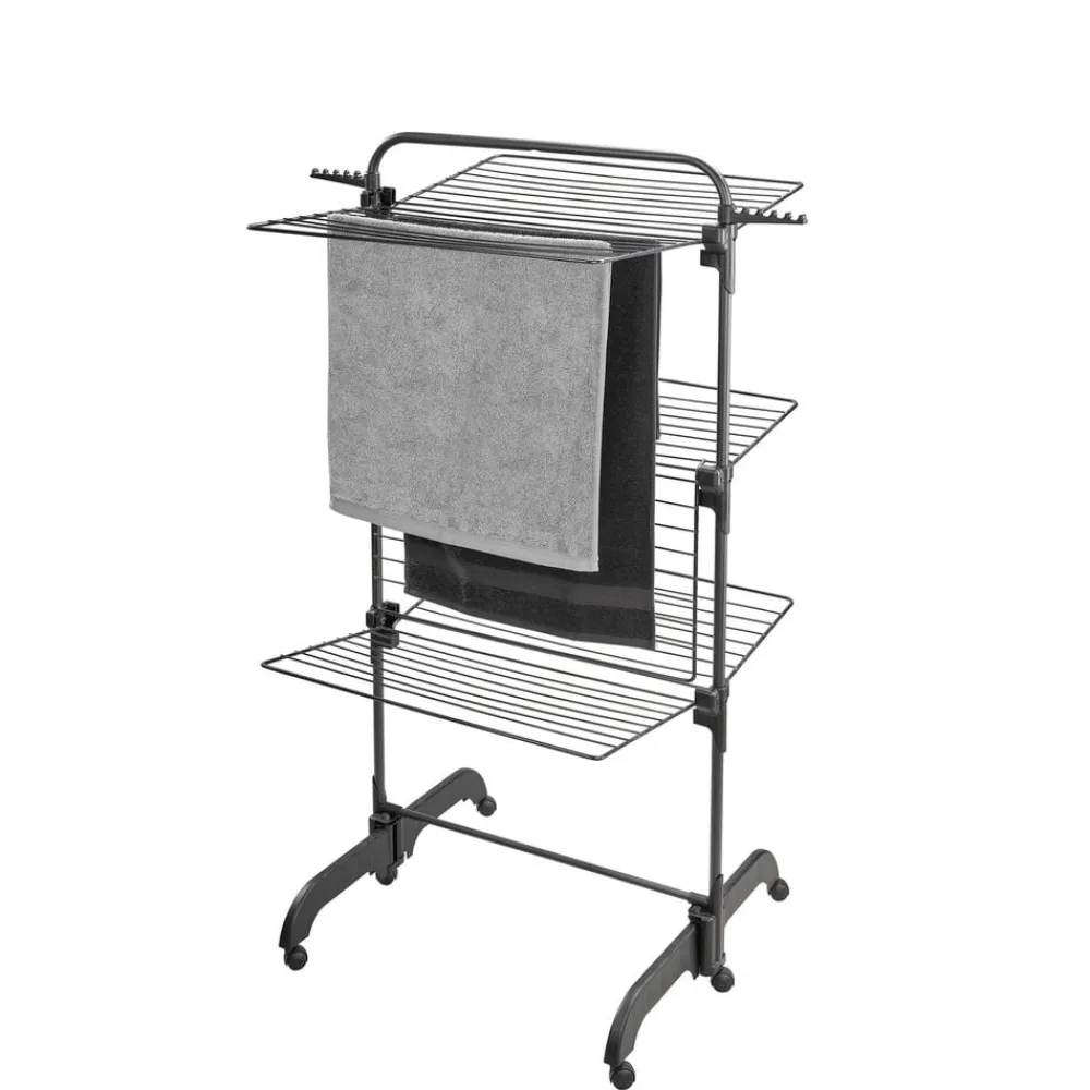 Comfort Tower 420 er et pladsbesparende tørrestativ, der udnytter højden og gør det nemt at tørre meget tøj på minimal gulvplads. Tørrestativet har tre fleksible tørreniveauer og i alt 42 meters tørreplads, og hver sektion kan klappes ned individuelt, så stativet også kan bruges op ad en væg eller radiator. Stativet er udstyret med to sidekroge, så du får ekstra ophæng til bluser og skjorter på bøjler. De seks 360° drejbare hjul gør det let at flytte stativet – selv når det er fuldt læsset – og når det ikke er i brug, kan det foldes fladt sammen og gemmes væk. 5 års garanti.