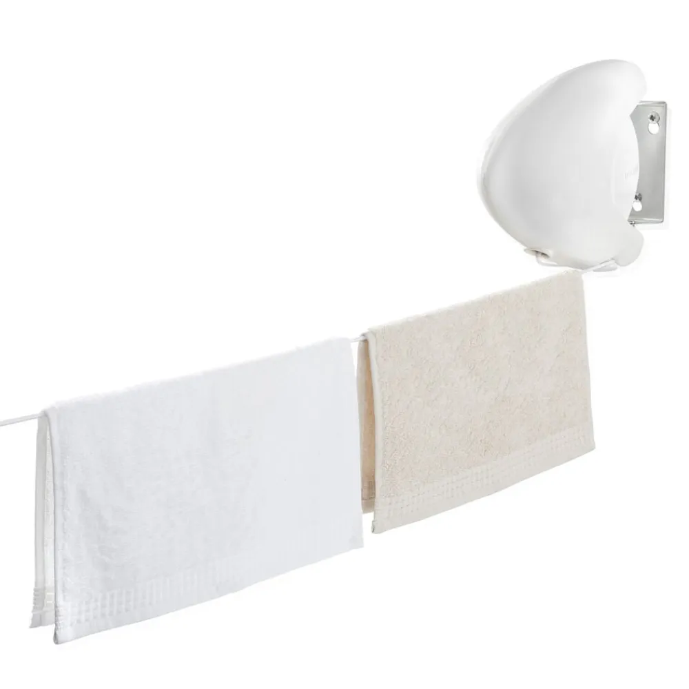 Væghængt tørrestativ med 1 line, længde op til 8 m (maks. 6 kg). Linen er pvc-coated og trækkes ind i holderen, når den ikke er i brug, hvilket beskytter mod vand og snavs.