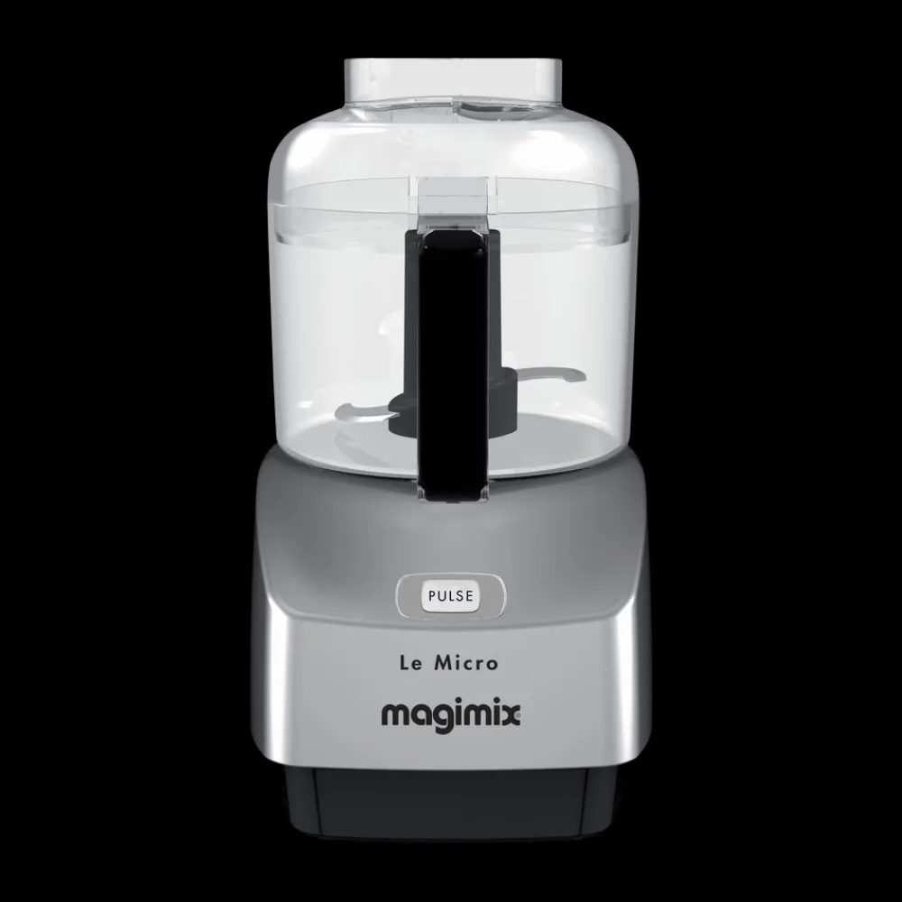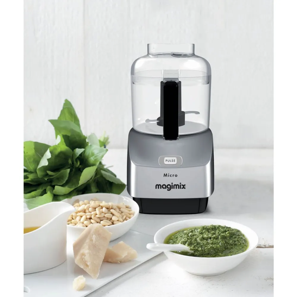 Magimix minihakker er effektiv, stilfuld og støjsvag. Den optager kun lidt plads på køkkenbordet og har et så flot design, at du gerne lader den stå fremme. Betjeningen er enkel. Låget har to åbninger til påfyldning af henholdsvis flydende og faste ingredienser, sættes let på og tages lige så nemt af. På fronten findes en enkelt knap til at aktivere både pulse-funktion og kontinuerlig kørsel, når knappen holdes nede.