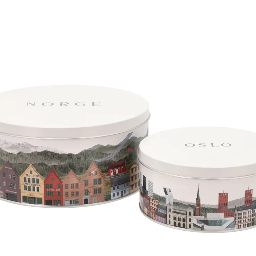 Martin Schwartz kagedåsesæt bestående af to runde dåser med norske motiver. Stor dåse med Norge-motiv, dia. 19,5 cm, højde 9 cm. Lille dåse med Oslo-motiv, dia. 14,6, højde 7 cm. Kagedåserne vaskes op i hånden.