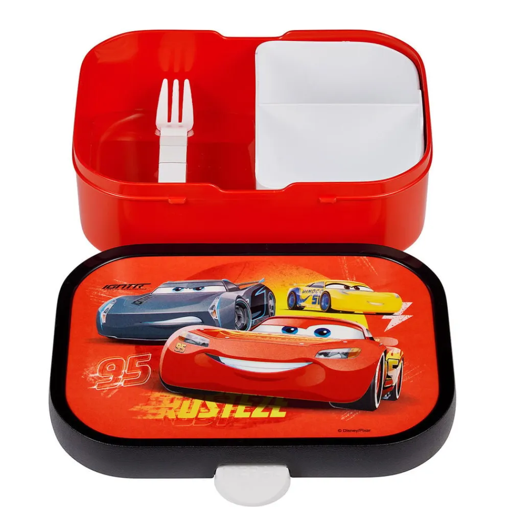 Robust og rummelig Mepal madkasse med Cars-motiv. Madkassen har en smart og effektiv lukkemekanisme, som er nem for børnene at betjene. Madkassen måler 17,5 x 13 x 6 cm og indeholder en lille gaffel og en aftagelig indsats med to små rum.