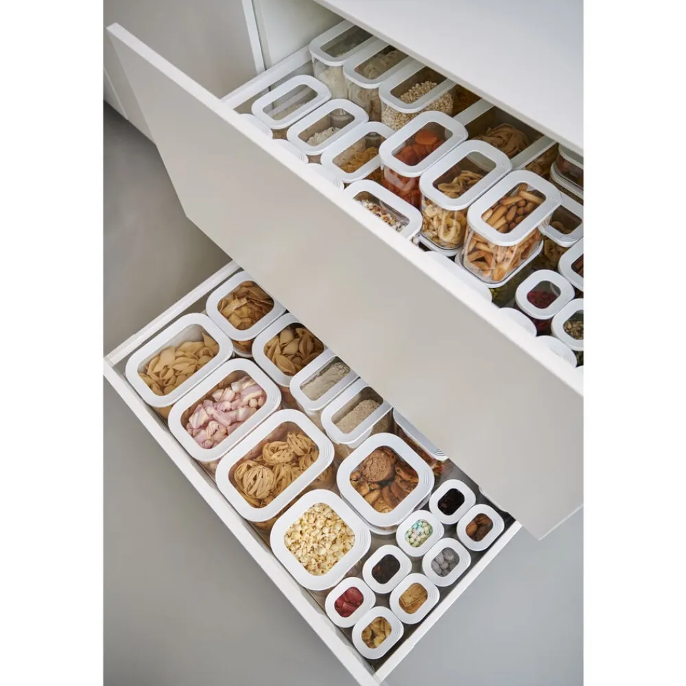 Modula opbevaringsboks med enkel, hvid kant på låget. Både boks og låg er gennemsigtige, hvilket gør det nemt at overskue indholdet. Mål: 14,5 x 9 x 5,5 cm. Boksen er fremstillet af SAN-plast, som er robust og modstandsdygtig overfor ridser. Velegnet til opvaskemaskine men ikke til mikroovn og fryser.
