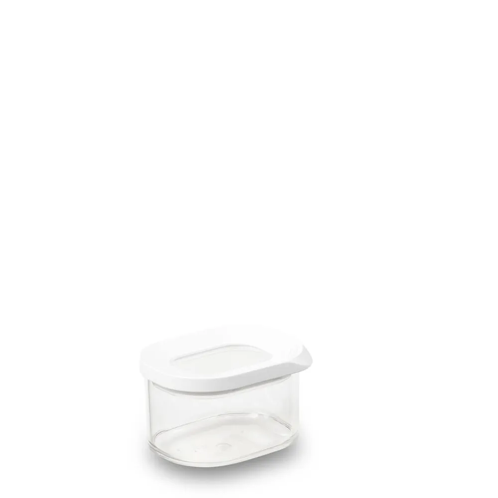 Modula opbevaringsboks med enkel, hvid kant på låget. Både boks og låg er gennemsigtige, hvilket gør det nemt at overskue indholdet. Mål: 9 x 7 x 5 cm. Boksen er fremstillet af SAN-plast, som er robust og modstandsdygtig overfor ridser. Velegnet til opvaskemaskine men ikke til mikroovn og fryser.