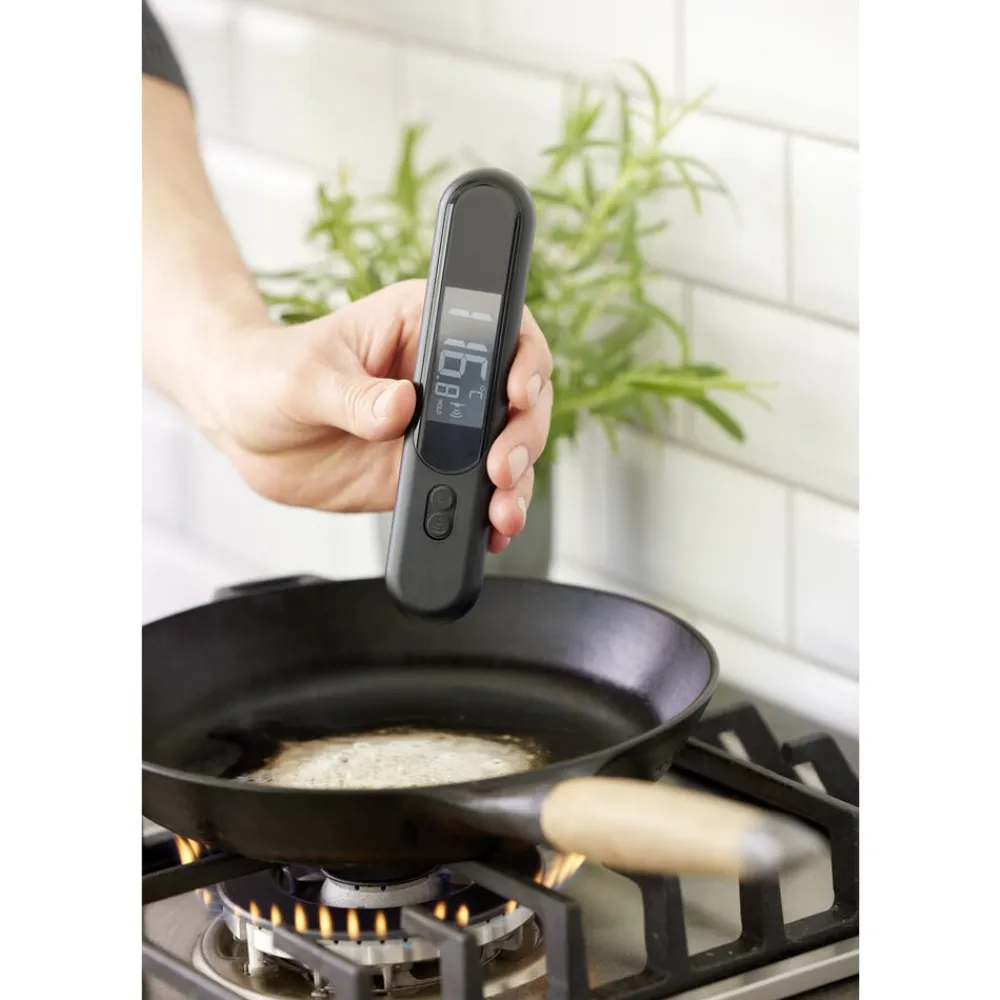 Kombineret termometer til infrarød måling og indstiksmåling. Infrarød måling er velegnet til berøringsfri måling af overfladetemperaturen på stegepanden, smeltet chokolade og lignende, og med spyddet kan du fx måle kernetemperaturen i din steg.