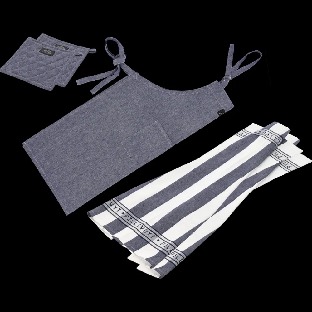 5 dele. Tekstilsættet består af forklæde 95 x 80 cm, 2 viskestykker 90 x 60 cm og 2 grydelapper 22,5 x 22,5 cm i bomuld/polyester.