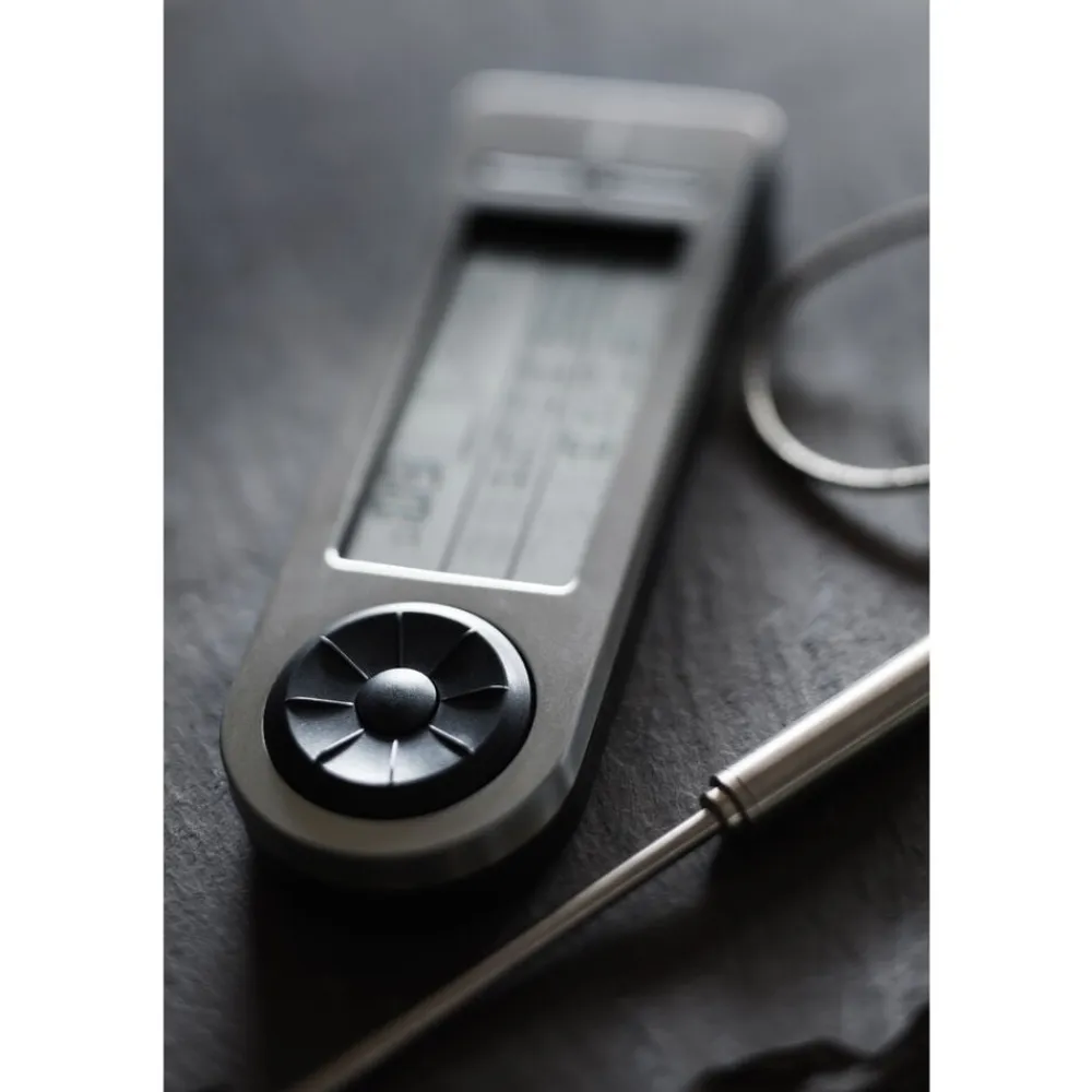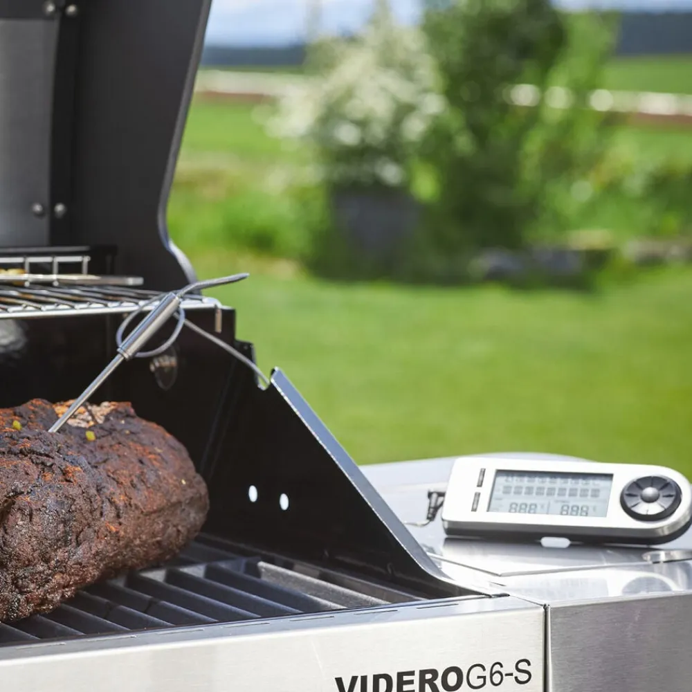 Til bestemmelse af den ideelle kernetemperatur for fem forskellige typer kød. To sensorer: en sensor måler temperaturen på kødet, og en anden måler grilltemperaturen. Måleområde -20 °C til +250 ° C. Visningssprog kan vælges fra tysk, engelsk eller fransk. Kabellængde 1 m. Bruger 2 x CR2032 knapcellebatterier (medfølger ikke)