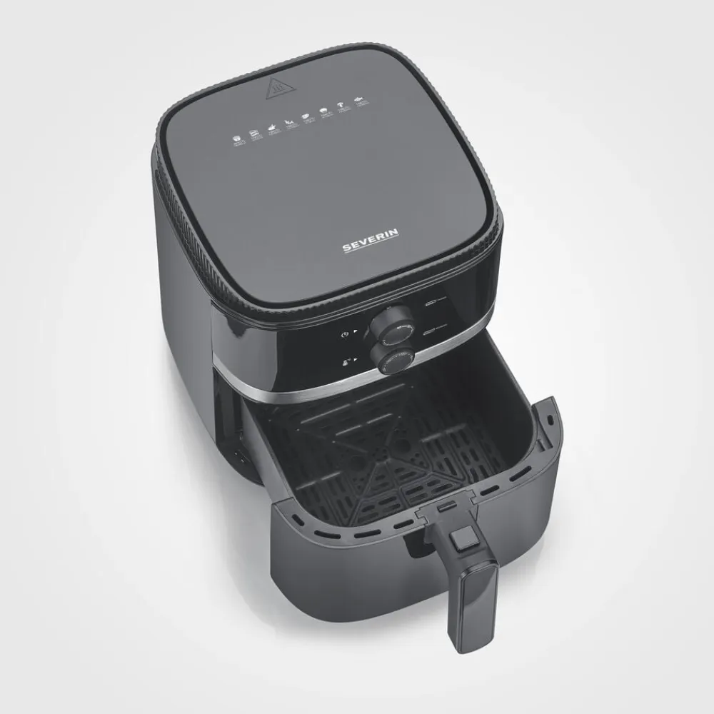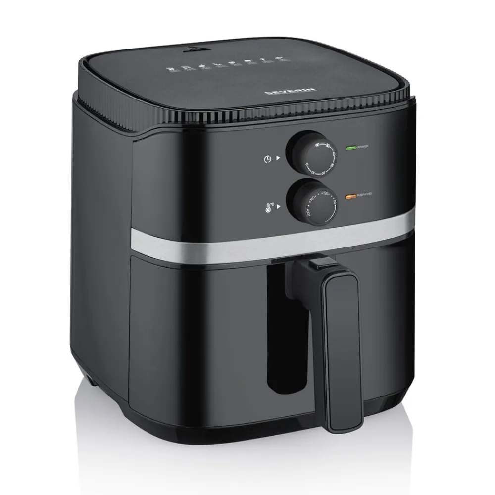 Airfryer til alsidig og hurtig tilberedning uden tilsætning af olie eller fedtstof. Stegekurven rummer op til 5 liter, hvilket svarer til 750 g pommes frites. Temperaturen kan justeres fra 80 til 200 grader, og airfryeren er forsynet med tænd/sluk-knap, indikatorlys og 60 minutters timer. 1500 watt. Sort.