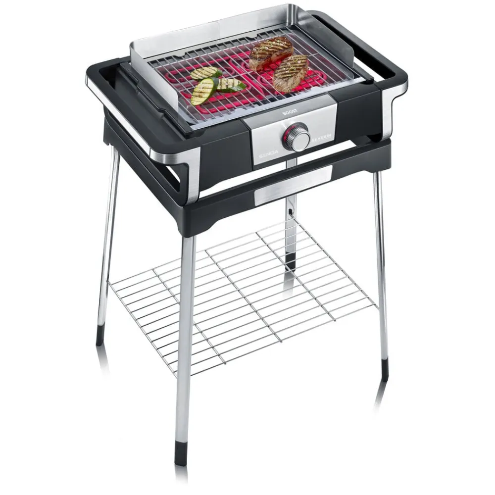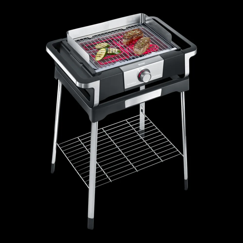 Smart elektrisk grill med ben og opbevaringshylde til både indendørs og udendørs brug, også som bordgrill. Med Safetouch-kabinettet kan grillen bruges på alle overflader. Boost-funktionen giver hurtig grillstart fra 0 til 500 grader på kun 10 minutter. Let at skille ad og rengøre. 3000 watt.