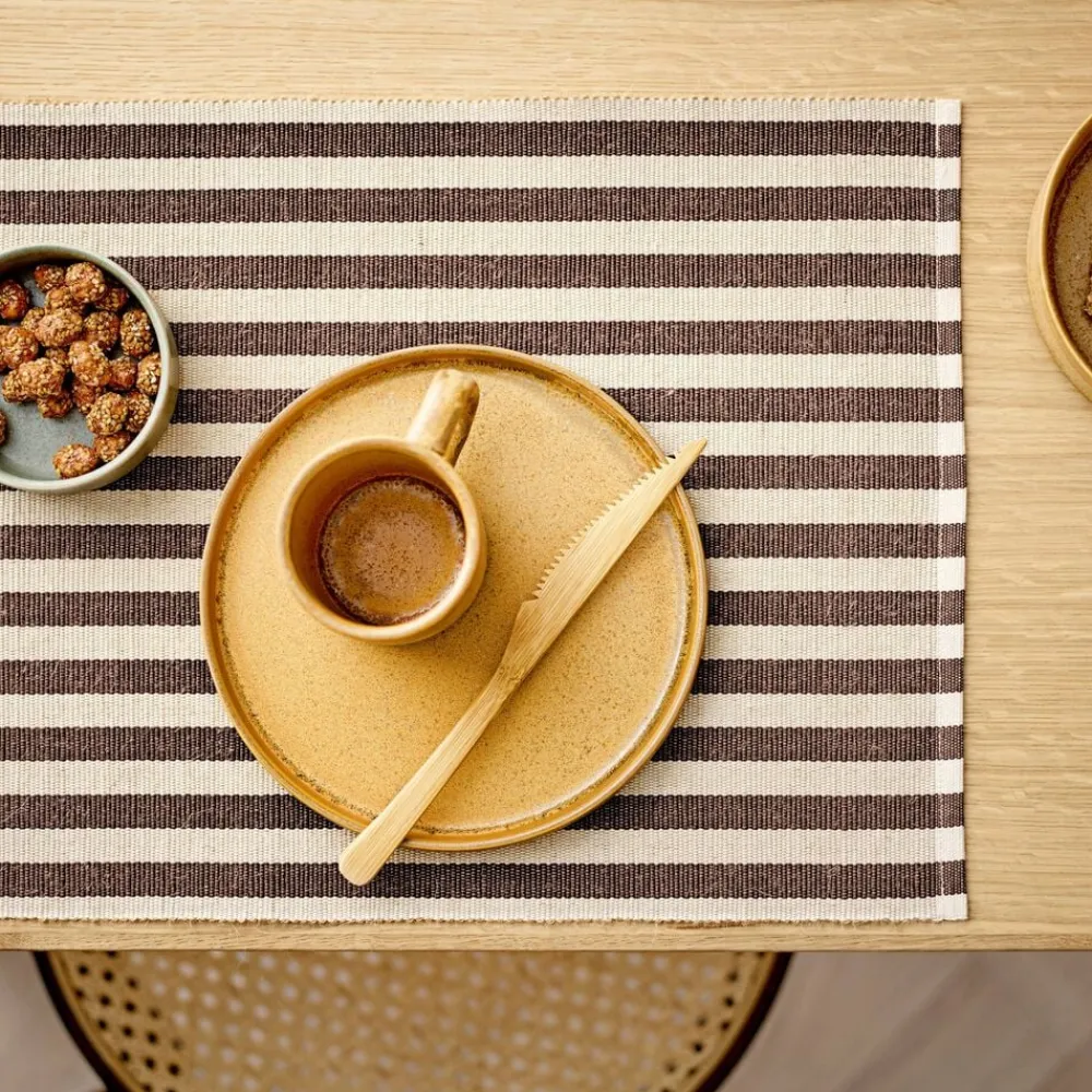 Disse klassiske striber med brede og ensartede linjer udgør den perfekte baggrund for hverdagslivet. Dækkeservietten er lavet af bomuld og jutefibre, hvilket giver den et charmerende og let rustikt udseende. Dækkeservietten fås i en række flotte farver, som giver indretningen et optimistisk løft.
