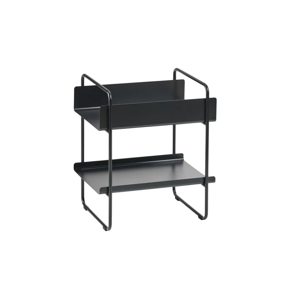Forskøn et hjørne i stuen eller sig smukt velkommen i entreen. Det smalle konsolbord i pulverlakeret metal kan passe ind i de fleste rum, selv steder hvor gulvpladsen er sparsom. Det leveres med to hylder, som du selv kan placere efter behag og behov. Den ene hylde har høj kant, som kan holde på håndklæder, hue/handsker, hundesnore eller hvad end du har brug for.
