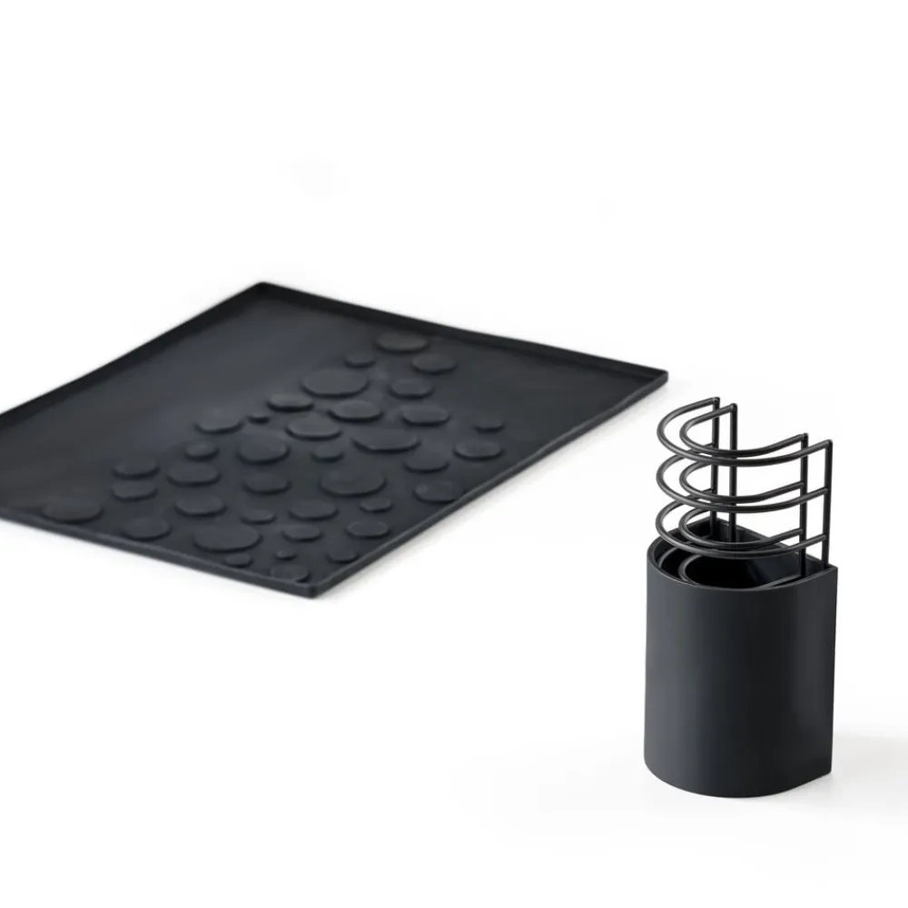 Stort design, der ikke fylder alverden. Diish opvaskebakken er en stilfuld ven ved vasken. Sættet består af en silikonebakke med boblemønster samt to tallerkenstativer, der kan lægges inden i hinanden og placeres i den medfølgende bestikholder. Dermed fylder sættet minimalt og kan let pakkes væk. Et oplagt valg til steder, hvor pladsen er knap.