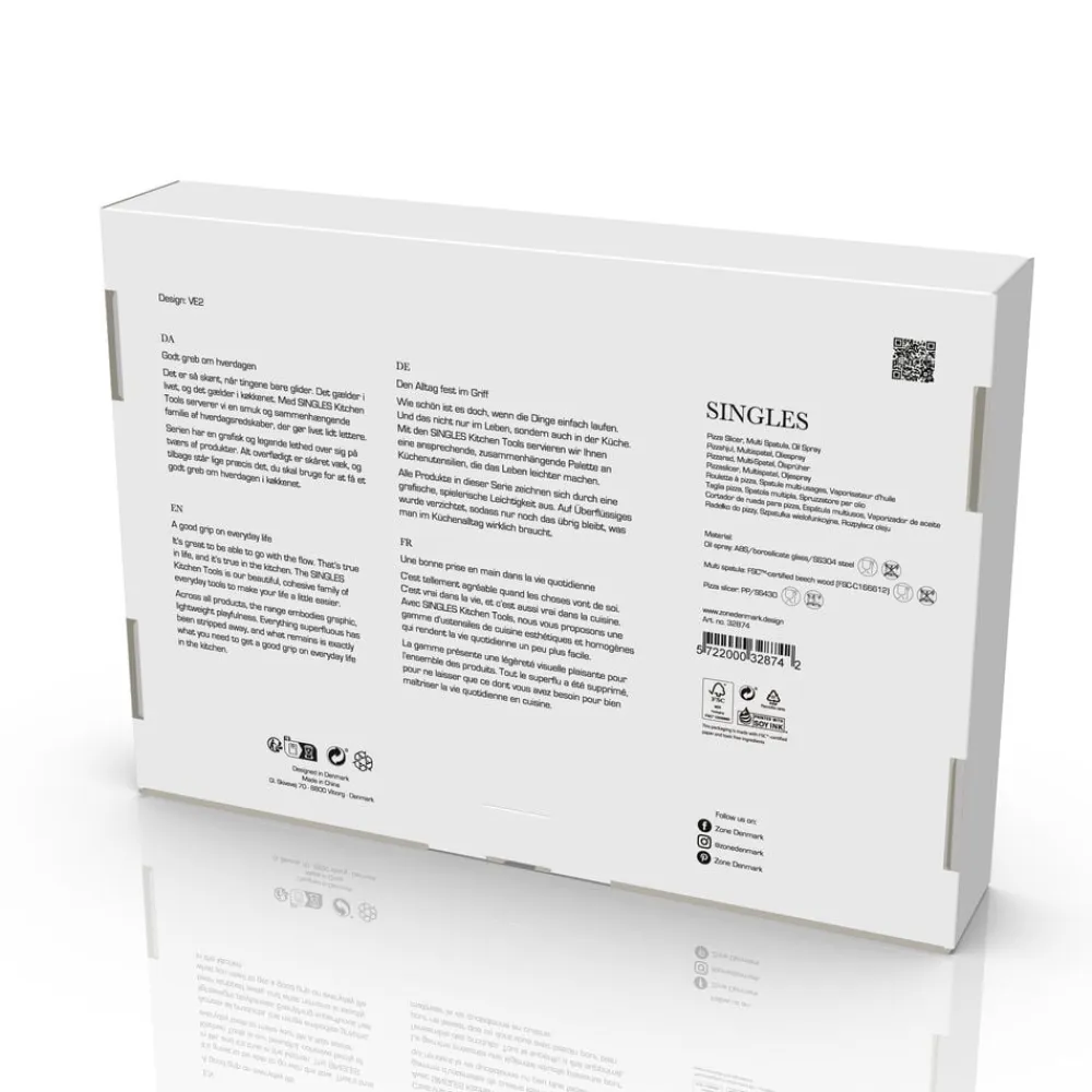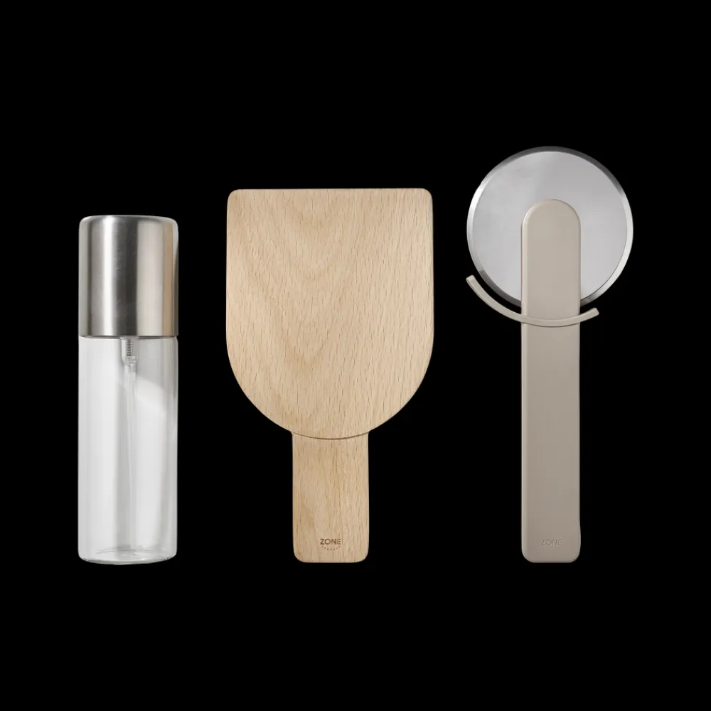 Pizzasættet består af 3 dele, Singles pizzahjul og Singles oliespray i Soft Taupe samt 18 x 10 cm multispatel i bøg.