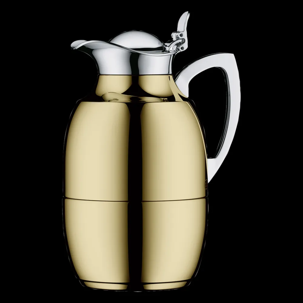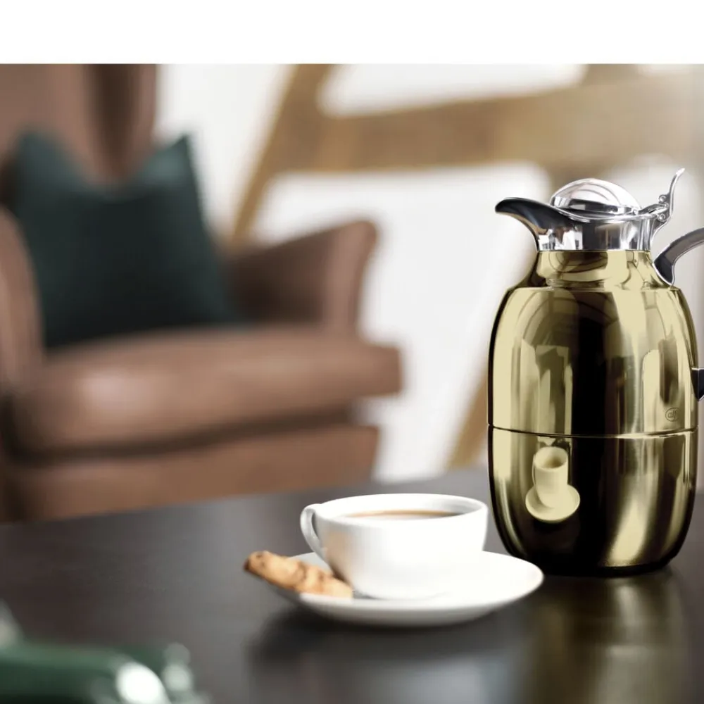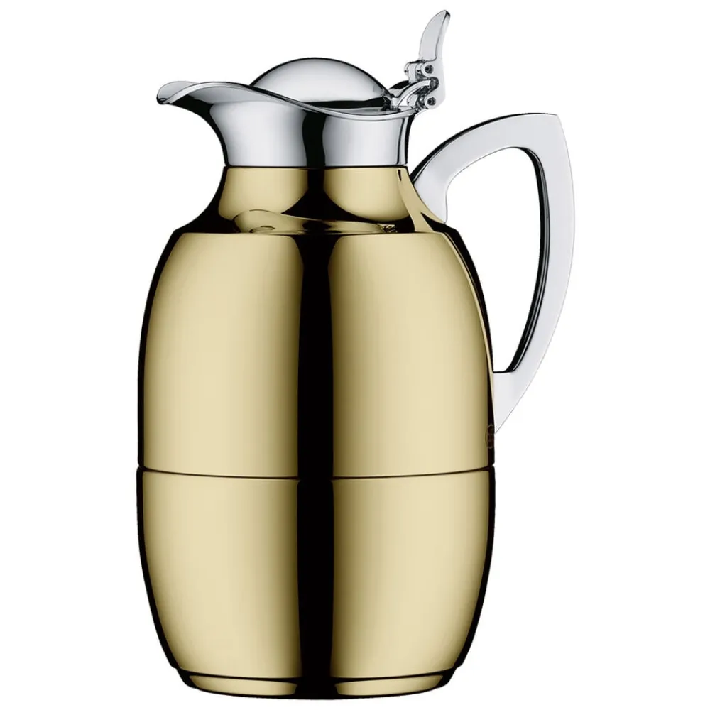Alfi Juwel er en af verdens mest kendte termokander, og det oprindelige stilrene design kan dateres helt tilbage til 1918. Termokande i poleret stål i høj kvalitet. Dobbeltvægget AlfiDur-indsats i isolerende og hærdet vakuum-glas. Holder varmt i 12 timer, holder koldt i 24 timer. Unikt og praktisk hældesystem. Kan betjenes med én hånd. Ergonomisk, forkromet metalhåndtag.