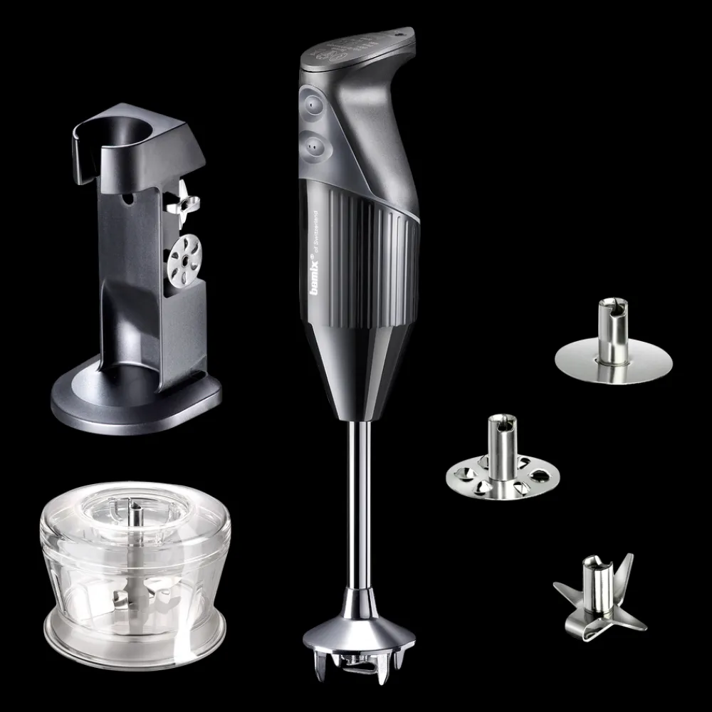 bamix® Deluxe-stavblender med en kraftig 200 watt motor, der sikrer pålidelig hjælp til selv de hårdeste opgaver i køkkenet. Stavblenderen har to hastighedsindstillinger, softgrip-sikkerhedsknap og en praktisk ledning, der giver masser af fleksibilitet. Til produktet medfølger multifunktionskniv, blenderskive, piskeskive, kværn og bordstander samt en instruktionsmanual. Livstidsgaranti på motor.